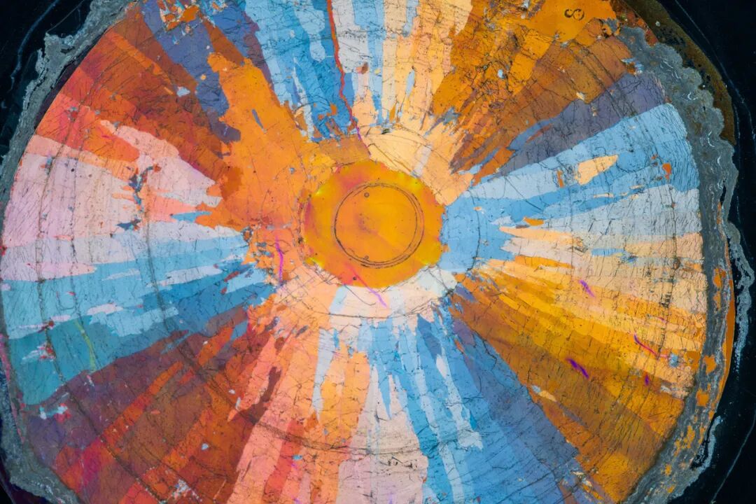 偏光技术看岩石超薄切片呈现如此丰富的色彩,是中国国家地理科学影像实验室的技术创新。第一张具有抽象艺术风格,又有科学传播价值的碳酸盐偏光切片样本与影像由此诞生。