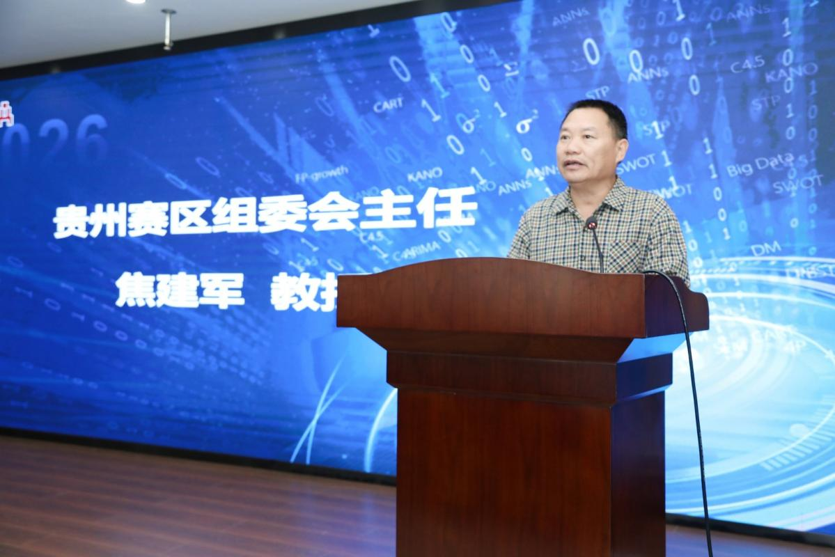 赛区组委会主任、贵州省大数据统计分析重点实验室焦建军教授回顾了此项赛事的发展历程,通报了本届贵州省赛的参赛情况,来自全省25所高校的6925名本科生报名参赛,历经知识赛网考、校实践赛选拔、省选拔赛报告评审等环节的激烈角逐,贵州大学、贵州财经大学、贵州商学院、贵州师范学院、贵州理工学院、黔南民族师范学院等6所高校的30支队伍入围本次决赛,共同角逐晋级全国总决赛的名额。他期望所有团队赛出水平、赛出风采,期待本届大赛涌现更多精彩作品。