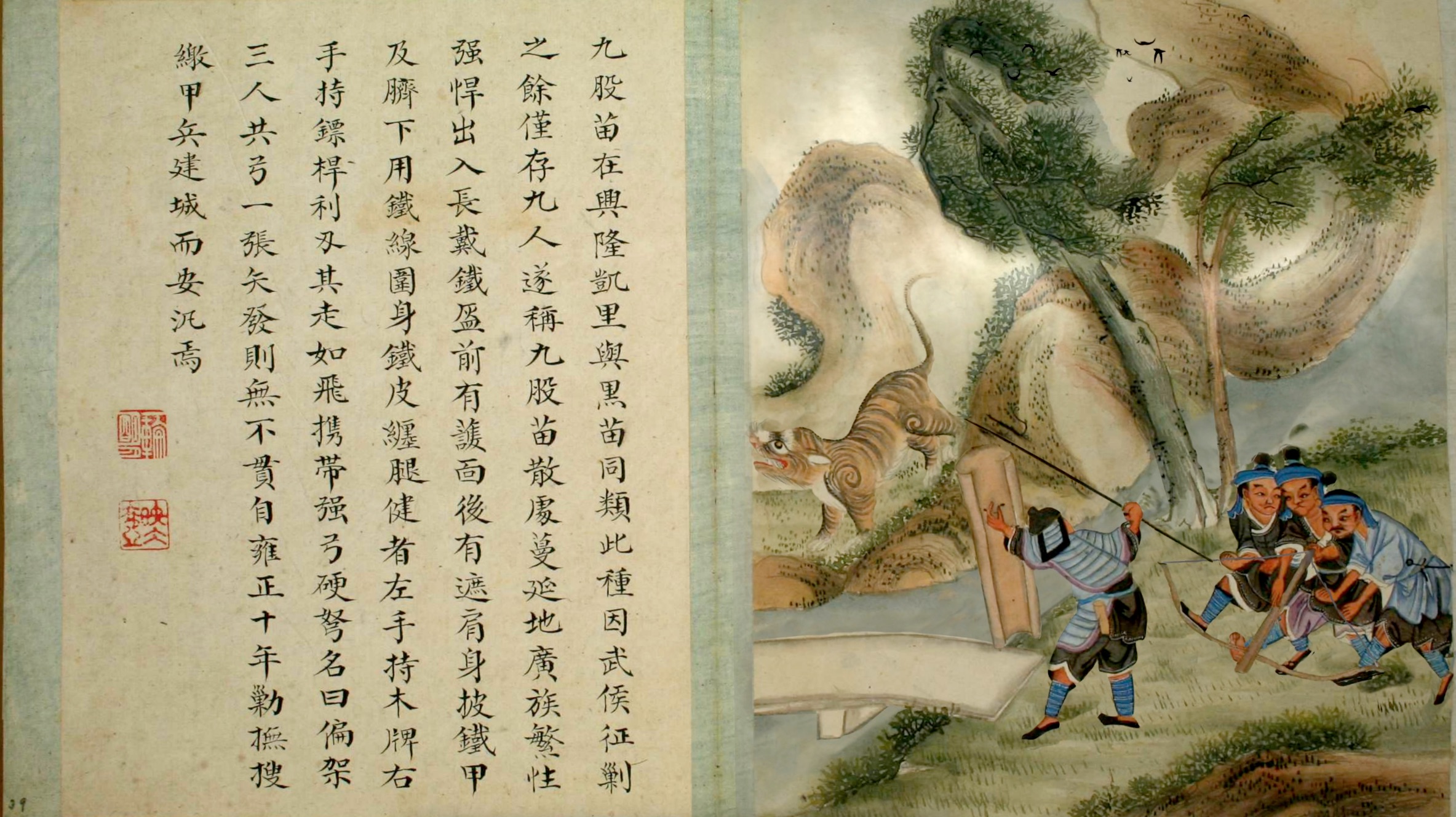 在贵州的典籍与传说中,虎的形象始终与这片土地的脉搏同频。清代《百苗图》中就有以工笔彩绘记录下虎的形象,讲述了一个鲜为人知的故事:“九股苗在兴隆凯里与黑苗同类。此种因武侯征剿之馀,仅存九人,遂称九股苗,散处蔓延地广族繁,性强悍,出入常头戴铁盔,前有护面,后有遮肩,身披铁甲及脐下用铁线围身,铁皮缠腿,健者左手持木牌,右手持镖杆利刃,其走如飞,携带强弓硬弩,名曰偏架,三人共弓,一张矢发,则无不贯自。