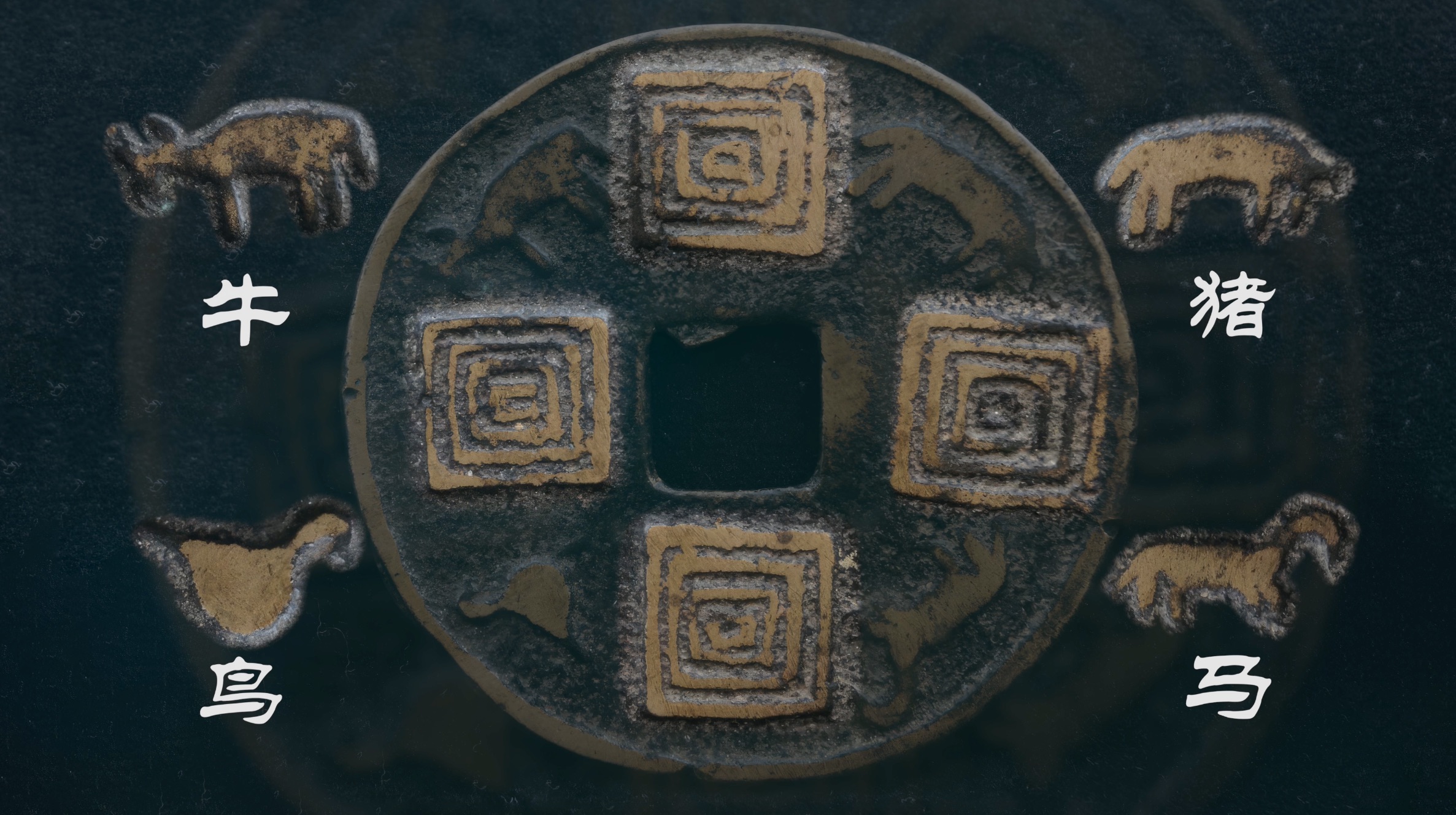 在这枚水书铜钱中,正面是龙虎旋行和两个回字云纹符号,反面是鸟、牛、猪、马图像和四个回字云纹,这些都是水书中常见的图形符号,将水族人、龙、雷、虎争天下的故事,用浅浮雕的塑造描绘,而这个故事在水书中也有它的影子。