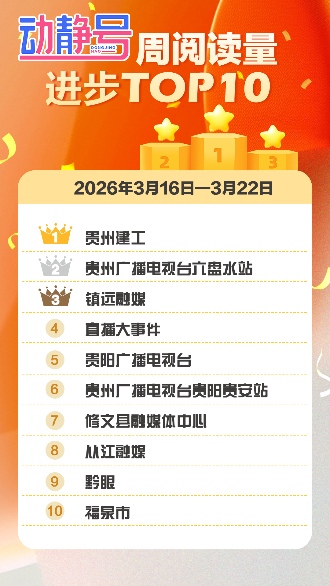 贵州建工、贵州广播电视台六盘水站、镇远融媒上周阅读量均突破10万,其中贵州建工阅读量冲破18万。
