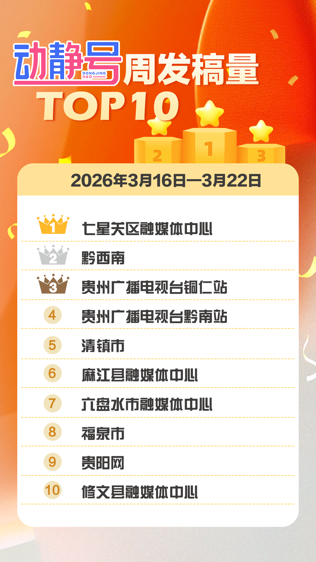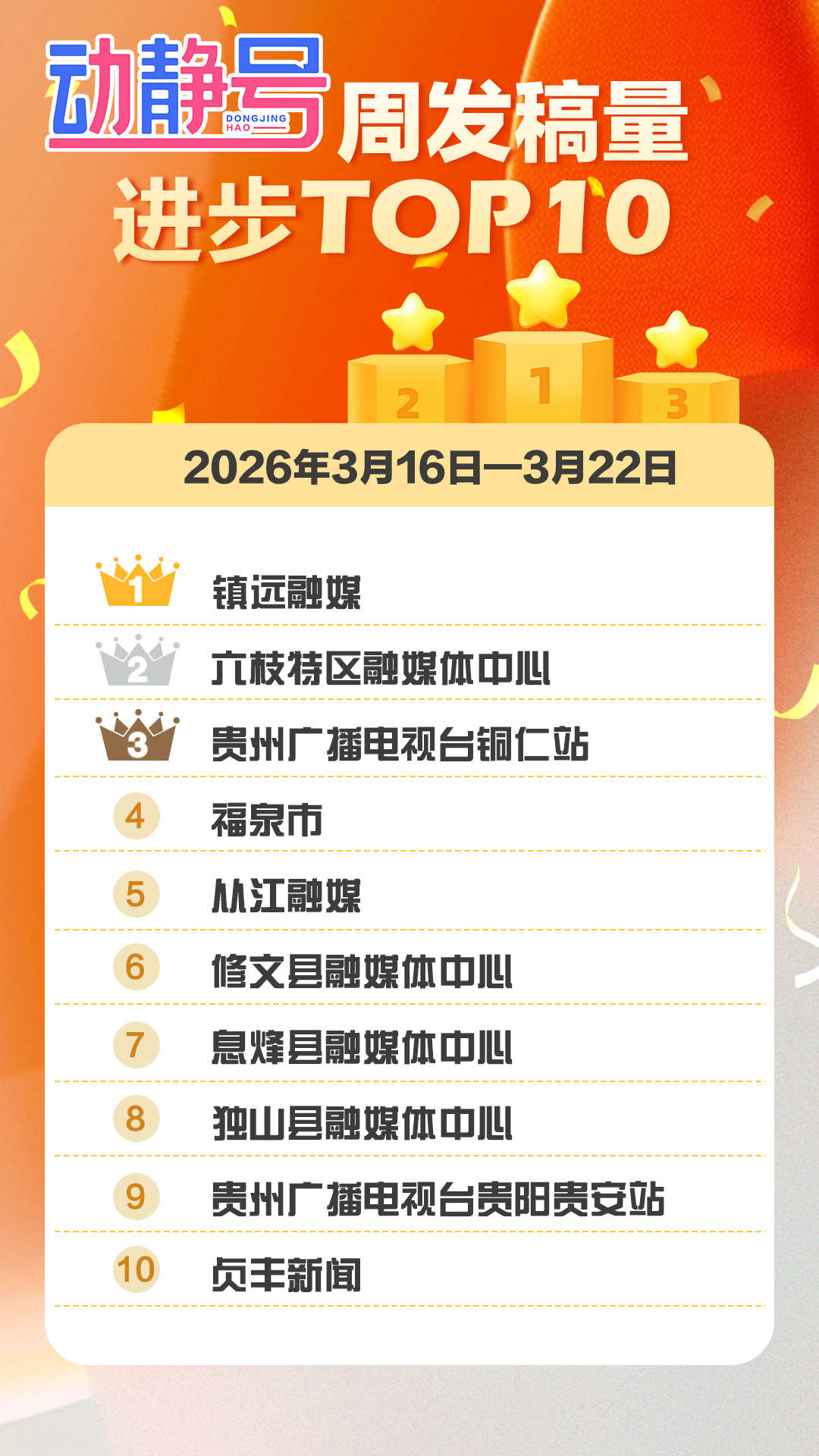 镇远融媒上周共发稿32条、六枝特区融媒体中心共发稿15条,优质内容稳定输出;贵州广播电视台铜仁站发稿量同比上周新增25%。