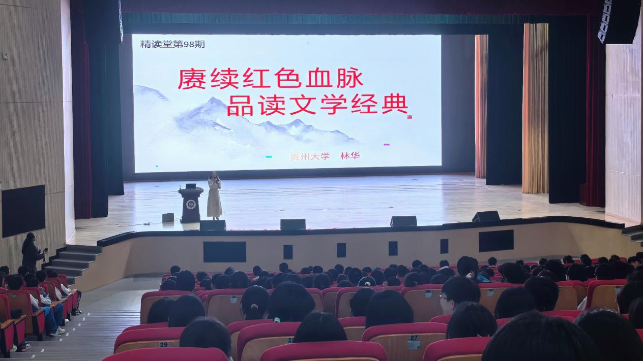 4月28日,由贵州省作家协会指导、贵州文学院主办、贵阳雅礼高级中学(贵阳市第九中学)承办的“精读堂”第98期讲座如期开讲。贵州大学人文学院副教授林华以“赓续红色血脉 品读文学经典——红色文学主题读书讲座”为宣讲主题,带领全校300多名师生走进红色文学的瑰丽世界,在字里行间感悟信仰力量,传承红色基因。本期讲座紧扣“多彩贵州 书香高原”,聚焦红色经典文学的精神内核与艺术价值,为师生呈上一场兼具思想深度与文学温度的文化盛宴。