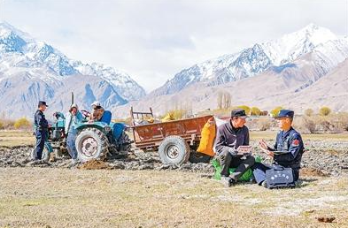 4月21日,新疆出入境边防检查总站喀什边境管理支队提孜那甫边境派出所民警向农户进行反诈宣传。民警深入田间地头,协助农户开展春耕播种,并结合虚假农资销售、冒领农业补贴、网络贷款诈骗等典型案例,讲解诈骗套路,提醒群众守住钱袋子。李展朋摄(影像中国)
