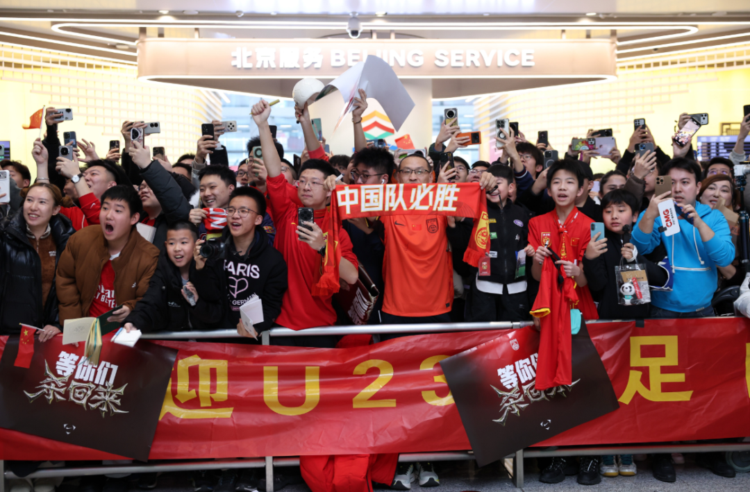 “青春无悔,国足扬威!欢迎英雄凯旋!”1月26日下午,北京大兴国际机场国际到达大厅,在球迷们的呐喊声和欢呼声中,U23国足队员戴着花环从抵达通道走了出来。一天前,他们在沙特举行的2026年U23亚洲杯中斩获亚军,创造了球队在该项赛事中的历史最佳成绩。