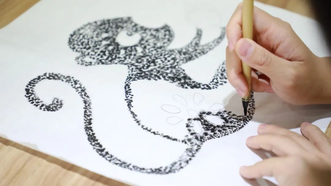 为传承颖拓艺术,在街道的支持下,王墨娟每年寒暑假都会在文化站开办免费学习班。面对不同年龄段的学生,她因材施教:针对小学生,以活泼可爱的十二生肖图案为切入点,引导孩子们制作专属颖拓作品;对于中学生,则融入书法元素,在颖拓中展现文字之美。这种寓教于乐的教学方式,让孩子们在轻松愉快的氛围中感受颖拓艺术的魅力。