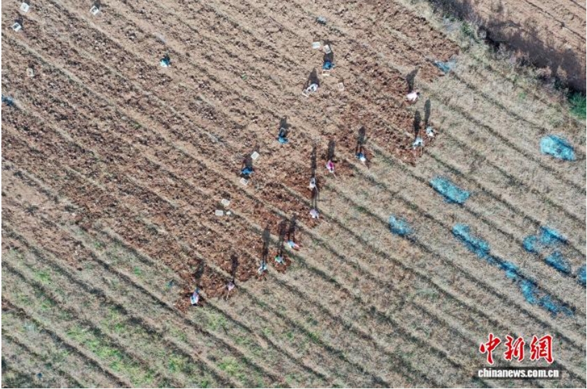 图为12月22日,航拍农户在麻乍镇松木坎村魔芋种植基地采挖魔芋。陈逍 摄
