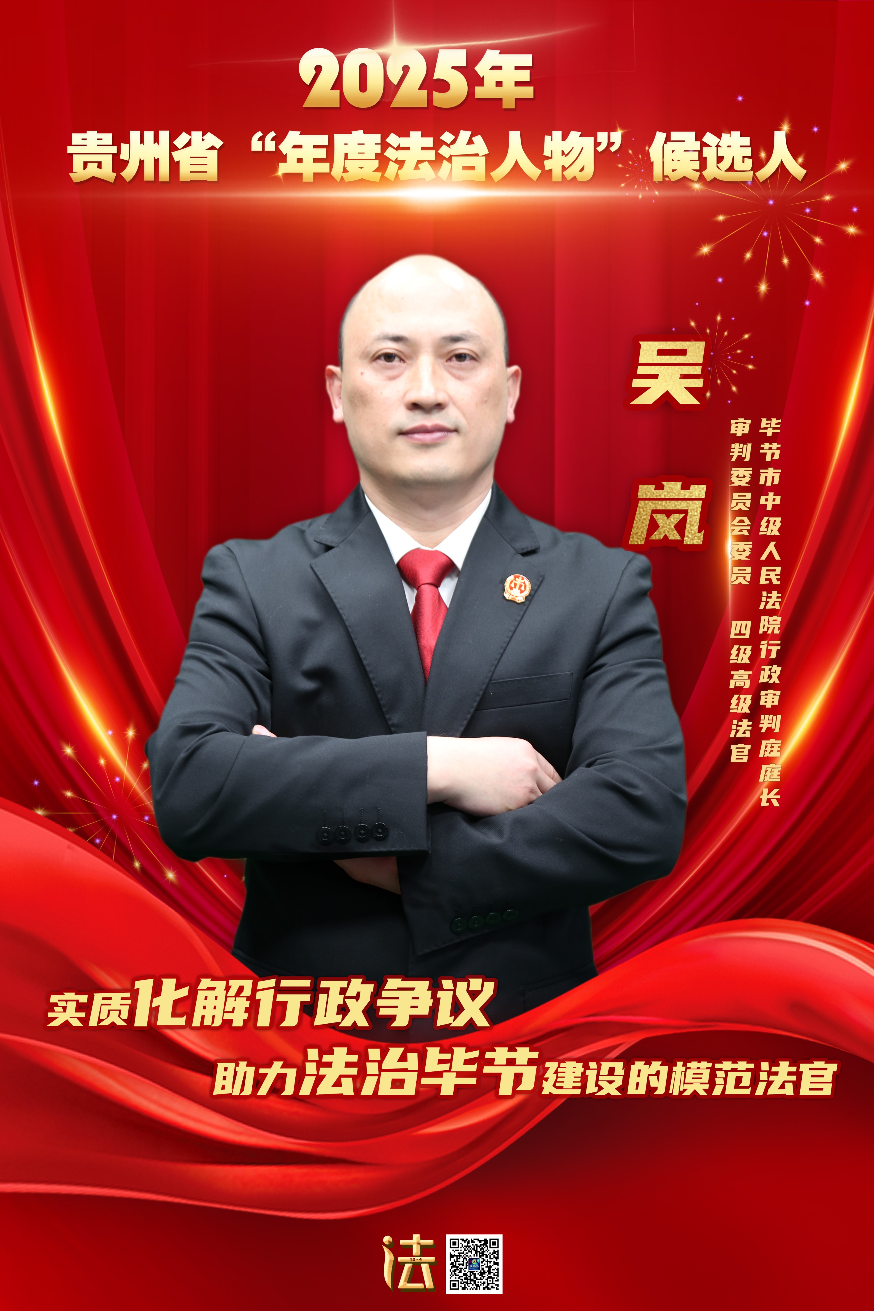吴岚,现任毕节市中级人民法院行政审判庭庭长、审判委员会委员、四级高级法官。他始终将“为大局服务,为人民司法”的理念融入审判实践,以高度的政治责任感和历史使命感投身法治建设,先后荣获“全国模范法官”“全国法院办案标兵”“贵州省审判业务专家”等多项荣誉,在法治毕节示范建设的画卷上留下了动人笔触。