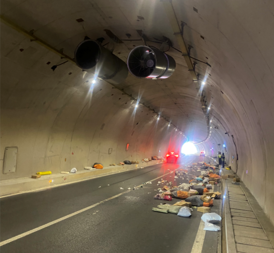 近日,安顺市紫云县公安局交通管理大队接群众报警称:在仁望高速紫云隧道内,一辆货车与隧道内固定安装的换气风机发生刮擦,快递包裹散落受损。