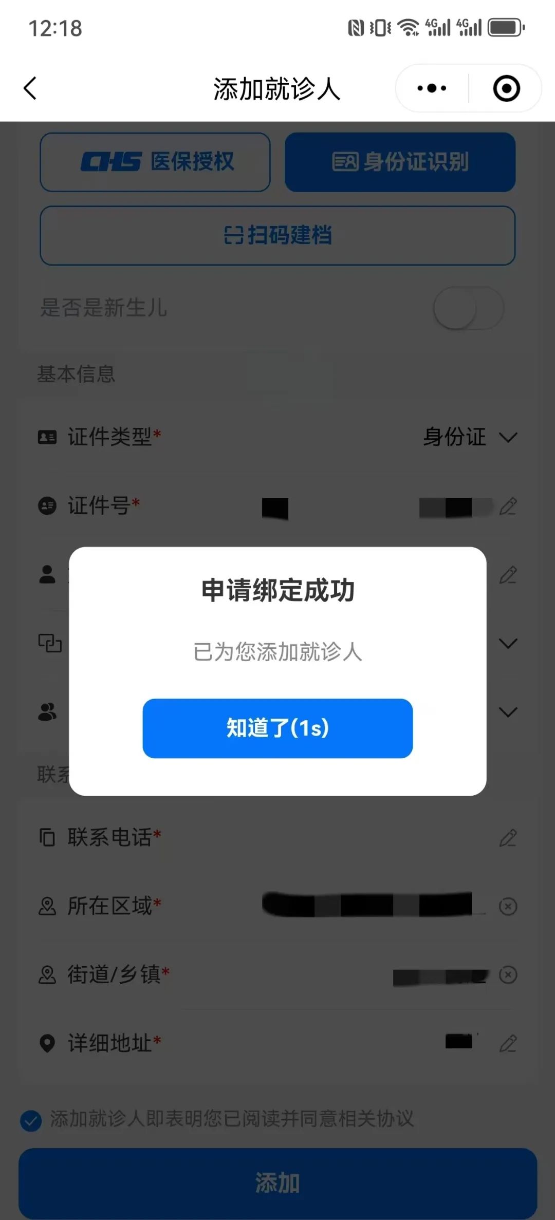 步骤六:填写就诊人信息后,勾选左下方提示,点击“添加”