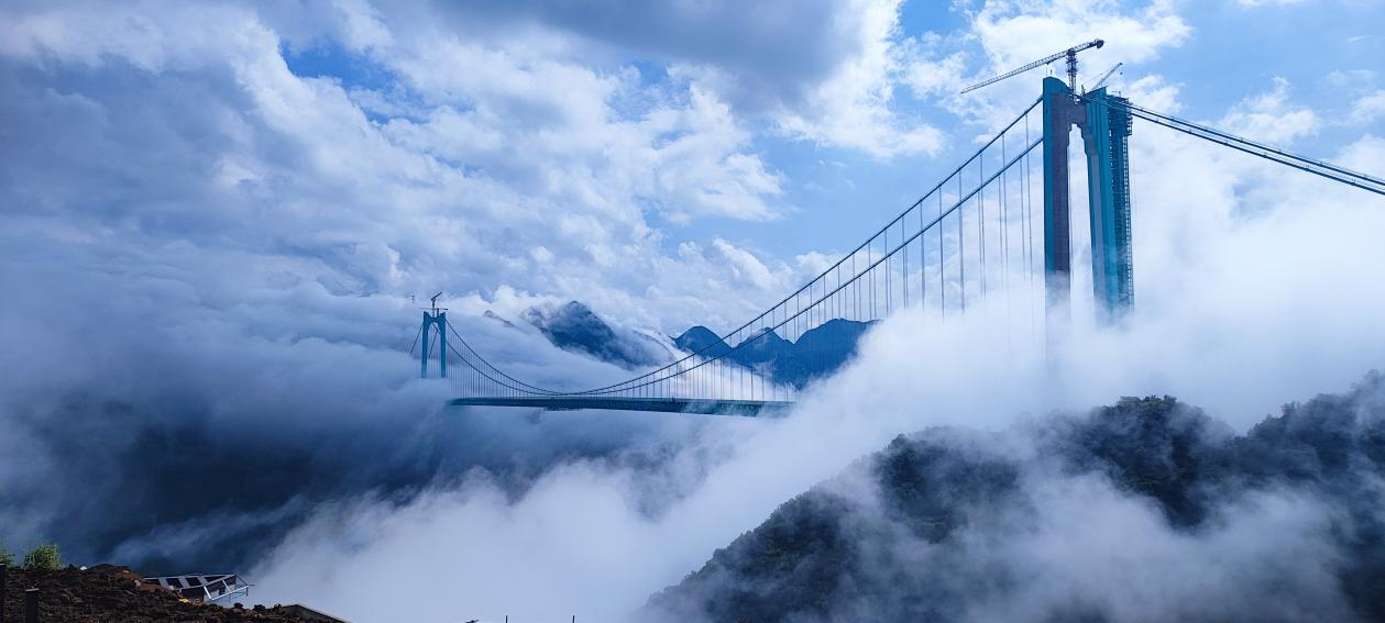 斗转星移,云开日耀,开天辟地,匠心匠魄,新技新标,赞我中华儿女技能高!看今朝,钢骨穿云,跨江连川惊世界。银绳破雾,越峰达岸傲苍穹。卫星定位,精准数控。衔岭咬崖,架设安稳精妙。任凭江涛裂岸,只管钢梁横空。七百米高有余、观光台上观风景;万千峰巅无计、游覧桥下游客情。啊!建桥人,建桥魂!建我中华精气神!大工匠,铸辉煌,把桥业的丰碑筑得更高。