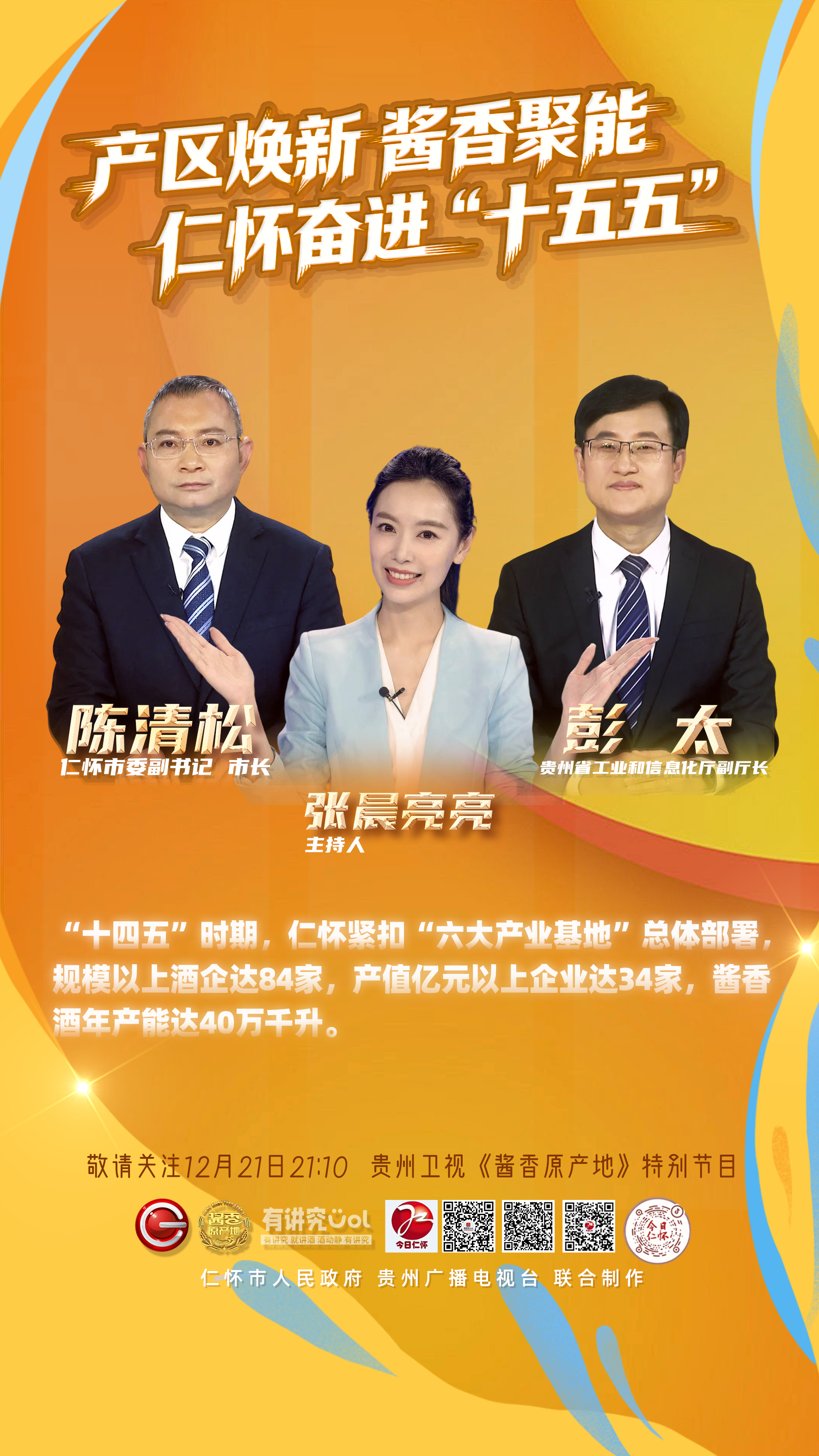 由仁怀市人民政府与贵州广播电视台联合制作的特别节目《产区焕新 酱香聚能 仁怀奋进 “十五五”》(下集)将于本周日(12月21日)21:10在贵州卫视《酱香原产地》栏目播出。