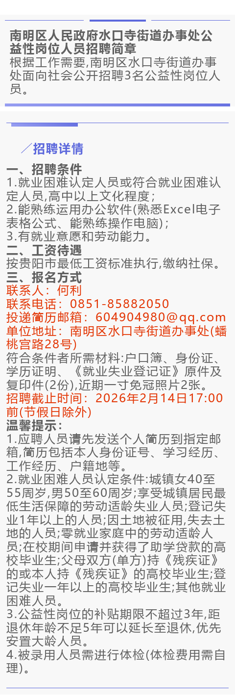 【政府机关】贵阳市南明区人民政府水口寺街道办事处招聘!高中起报!