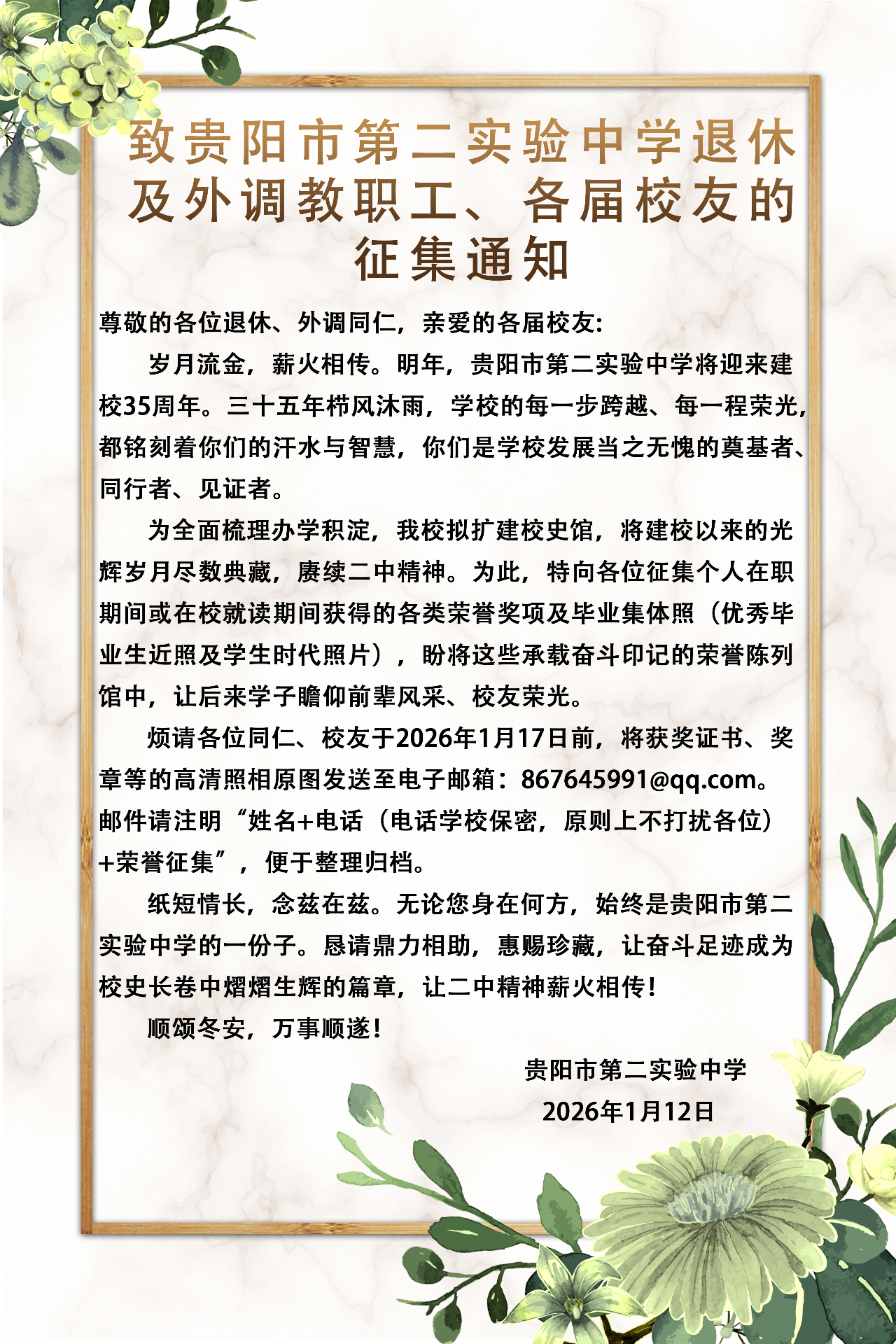 致贵阳市第二实验中学退休及外调教职工、各届校友的征集通知