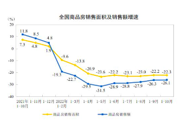 15日,国家统计局发布今年1-10月房地产相关数据,1-10月份,商品房销售面积111179万平方米,同比下降22.3%,其中住宅销售面积下降25.5%。商品房销售额108832亿元,下降26.1%,其中住宅销售额下降28.2%。