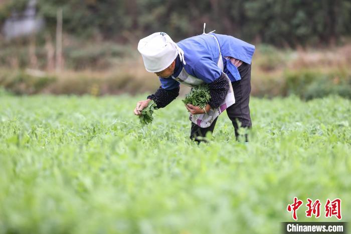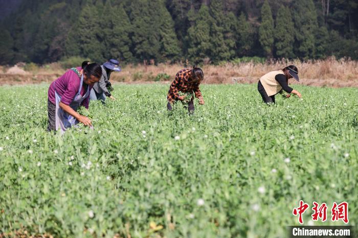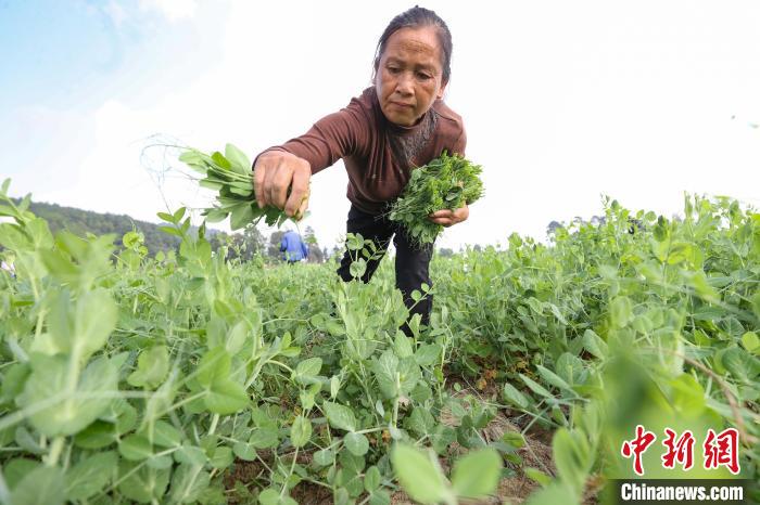 11月15日,农户在贵州省黔南布依族苗族自治州龙里县湾滩河镇采摘豌豆尖。中新社记者 瞿宏伦 摄