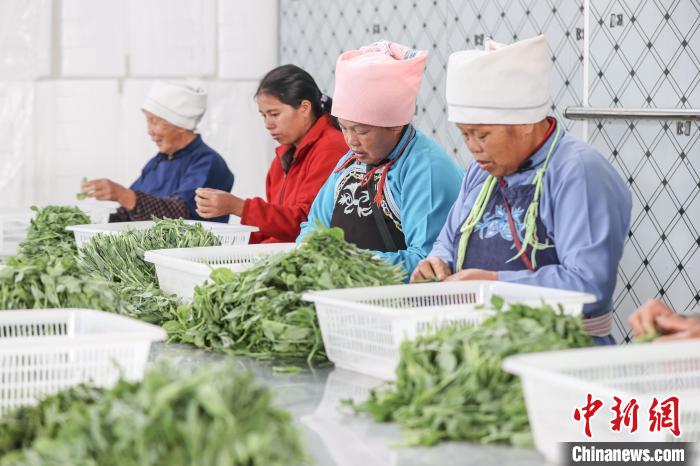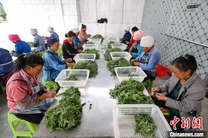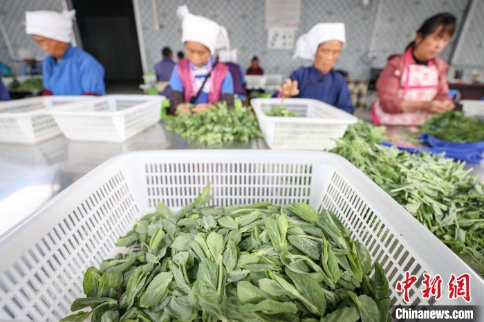 11月15日,工人在贵州省黔南布依族苗族自治州龙里县湾滩河镇分拣完成的豌豆尖。中新社记者 瞿宏伦 摄