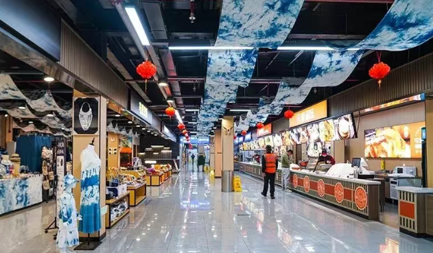 升级改造后的云峰服务区,处处彰显屯堡文化魅力。入口文化斑马线绘有黄果树瀑布等意象,主楼安顺文化IP“安安”“顺顺”成打卡点,蜡染文创店、贵州特产馆让旅客带走“黔味”记忆。
