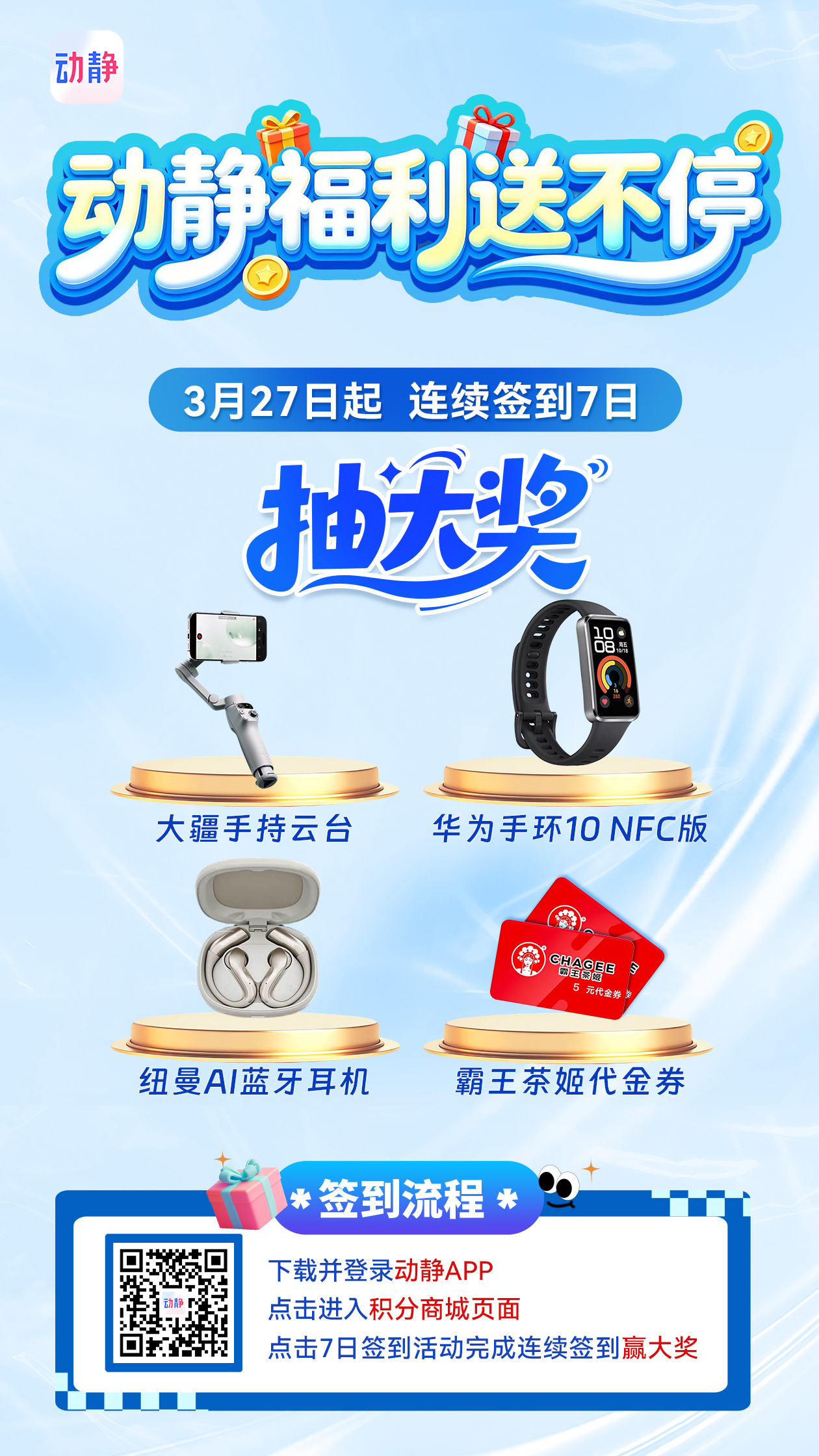 来动静,连续7天签到赢豪礼!大疆手持云台+华为手环+蓝牙耳机……等你拿