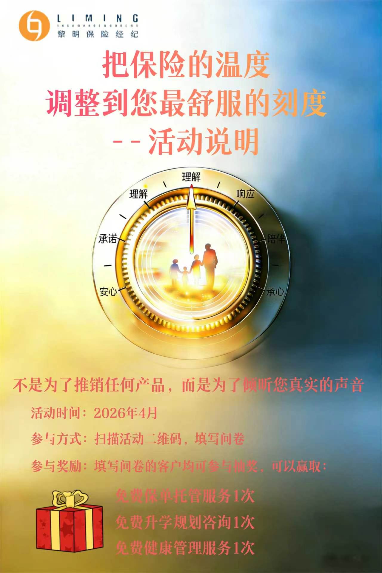 在保单托管服务获得市场广泛认可的基础上,为了进一步下沉倾听广大市民的心声,了解大家在保险服务全流程中的真实期待与建议,黎明保险经纪贵州分公司于 4 月暖心启动 2026 年客户服务节。本届客服节以 “把保险的温度调到你想要的刻度” 为核心理念,不做产品推销,只专注收集客户反馈,并以此为标尺优化服务,让保险服务更贴合每个家庭的实际需求。
