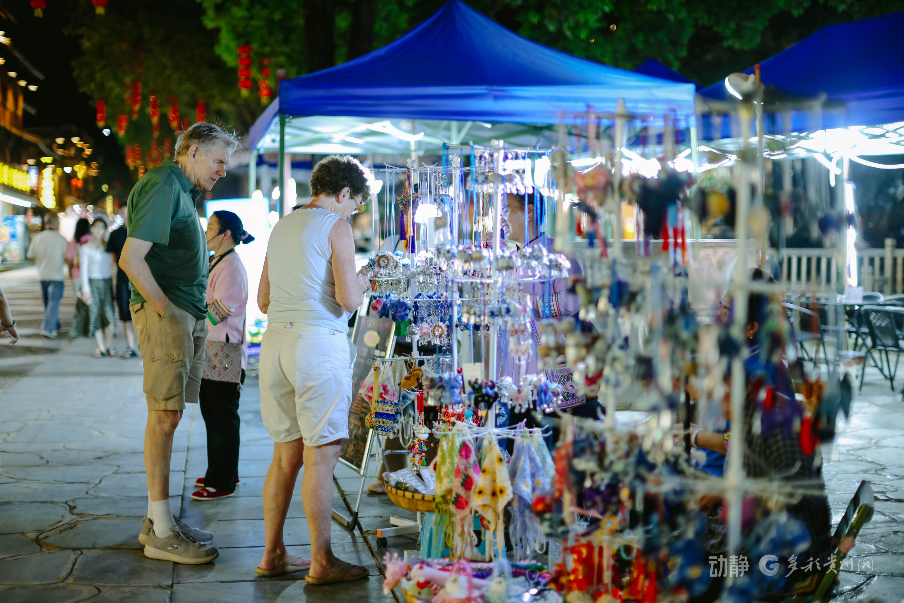 夜晚肇兴侗寨内游客挑选手工文创品