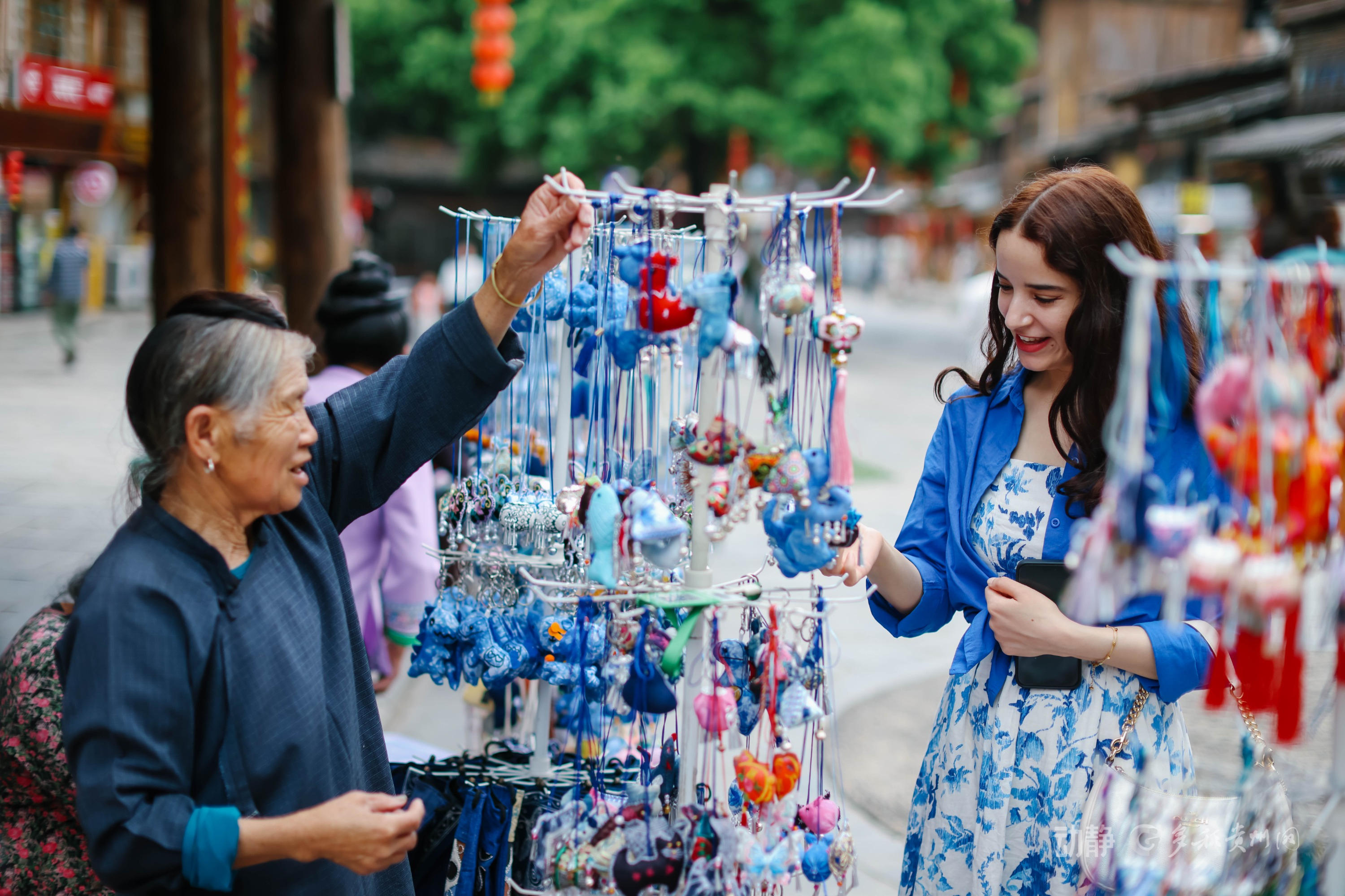肇兴侗寨内摩纳哥游客驻足挑选当地手工艺品,感受侗族文化魅力