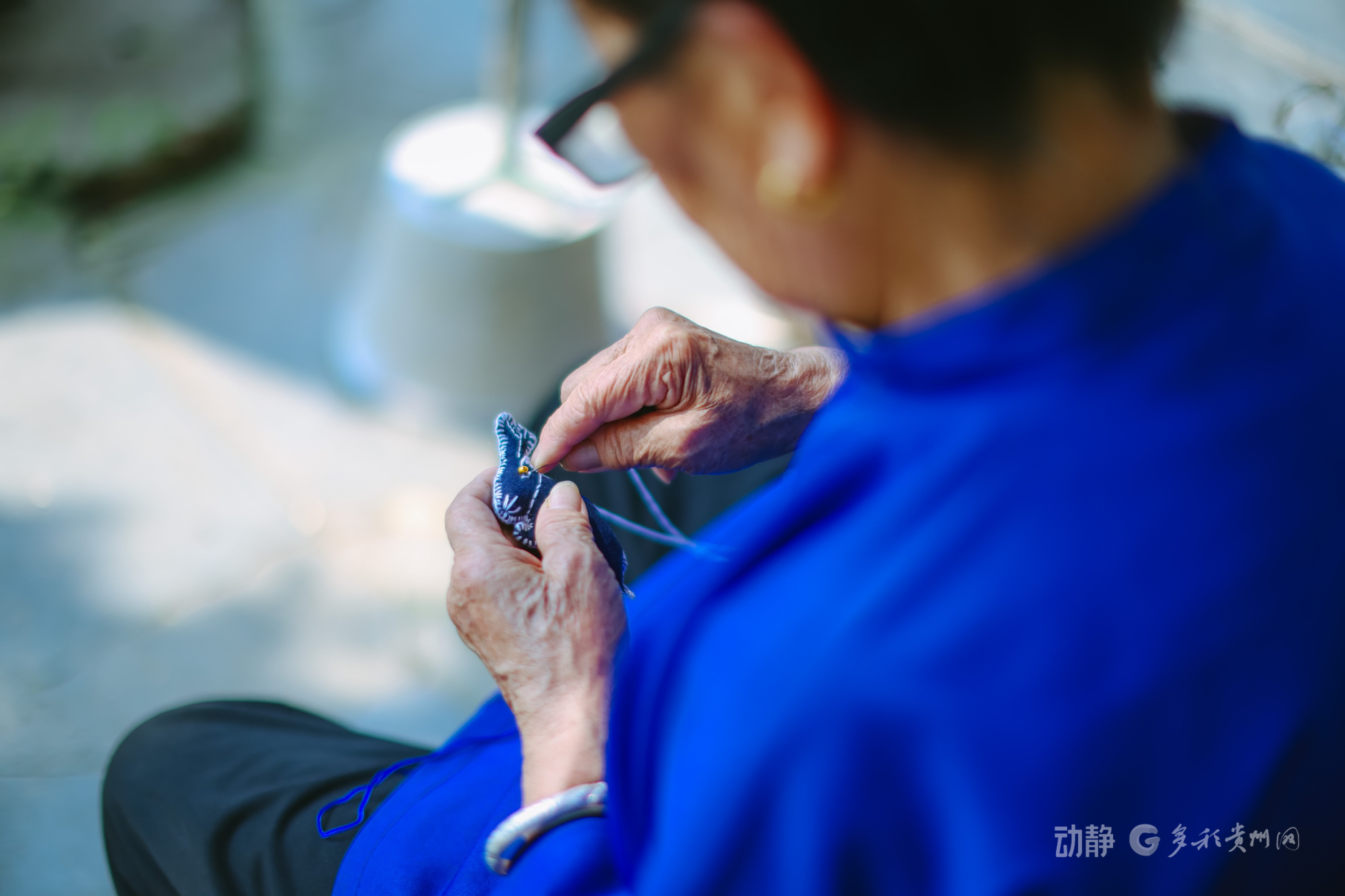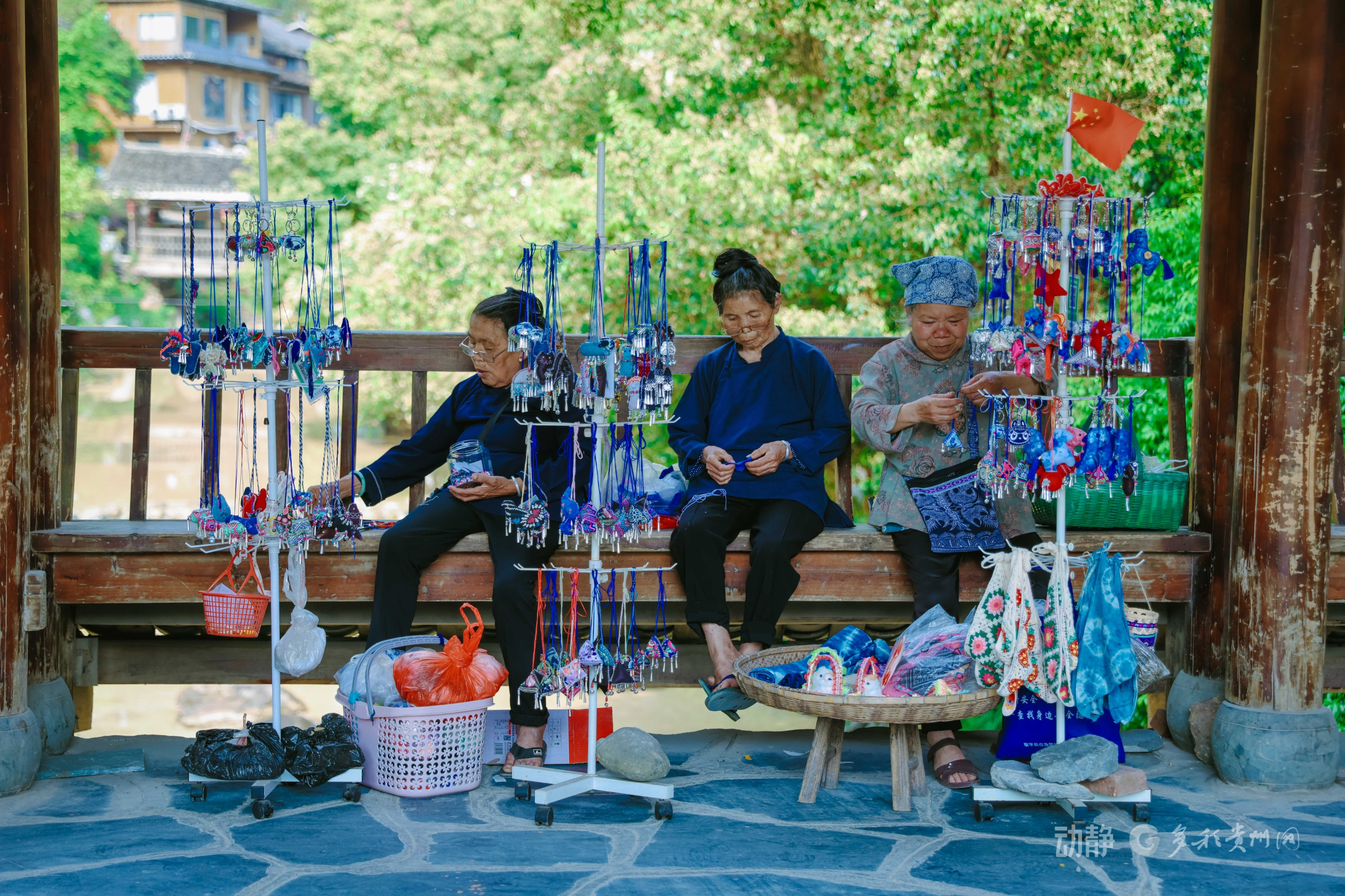 风雨桥上侗族手艺人正在制作绣品