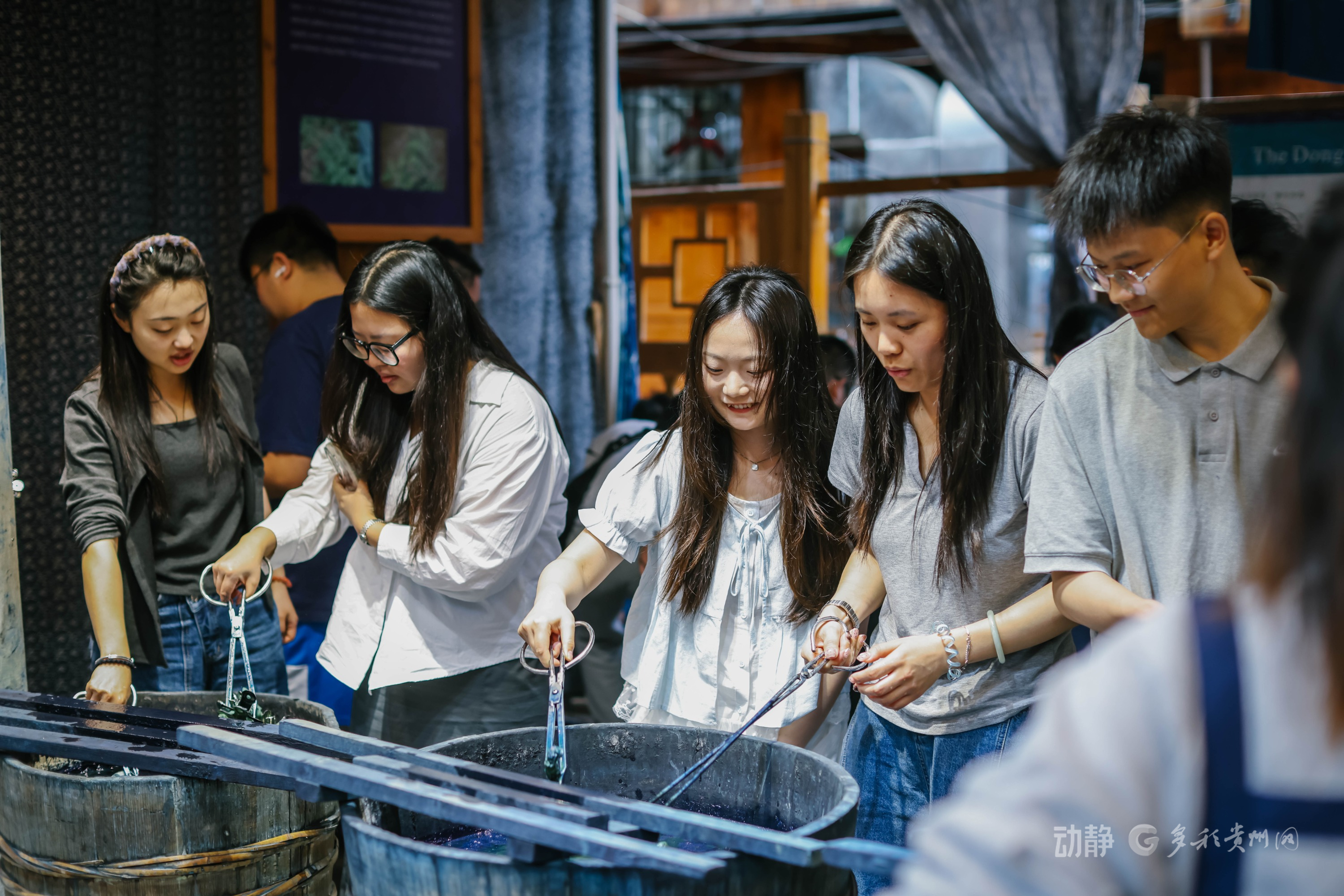 游客在侗品源体验馆内体验扎染