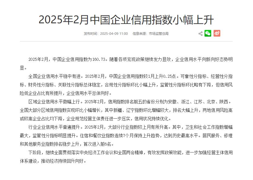 记者今天(4月9日)从市场监管总局获悉,今年2月,中国企业信用指数为160.73。随着各项宏观政策继续发力显效,企业信用水平向新向好态势明显。