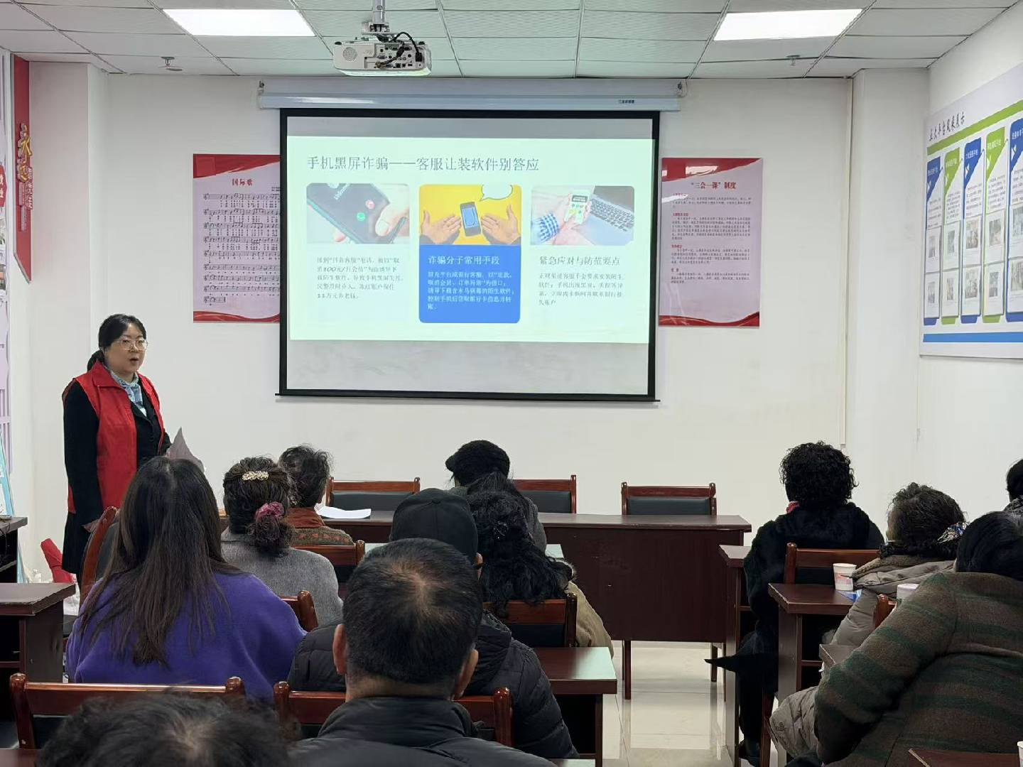 活动现场,支行工作人员通过PPT进行直观讲解,重点围绕老年群体易受骗的诈骗类型展开,深入剖析了虚假养老服务、保健品推销、仿冒亲友求助等常见诈骗手段。工作人员结合老年人心理特点,详细讲解诈骗分子如何利用老年人防范意识薄弱、渴望关怀等心理实施诈骗,引导老年人增强警惕意识,提升自我保护能力。工作人员还结合贵阳市近期发生的新型诈骗案例,深入讲解了诈骗手段的隐蔽性与变化趋势,并传授了实用的识别与应对技巧。通过真实案例的剖析,进一步敲响反诈警钟,帮助老年人认清诈骗的本质,增强防范意识。