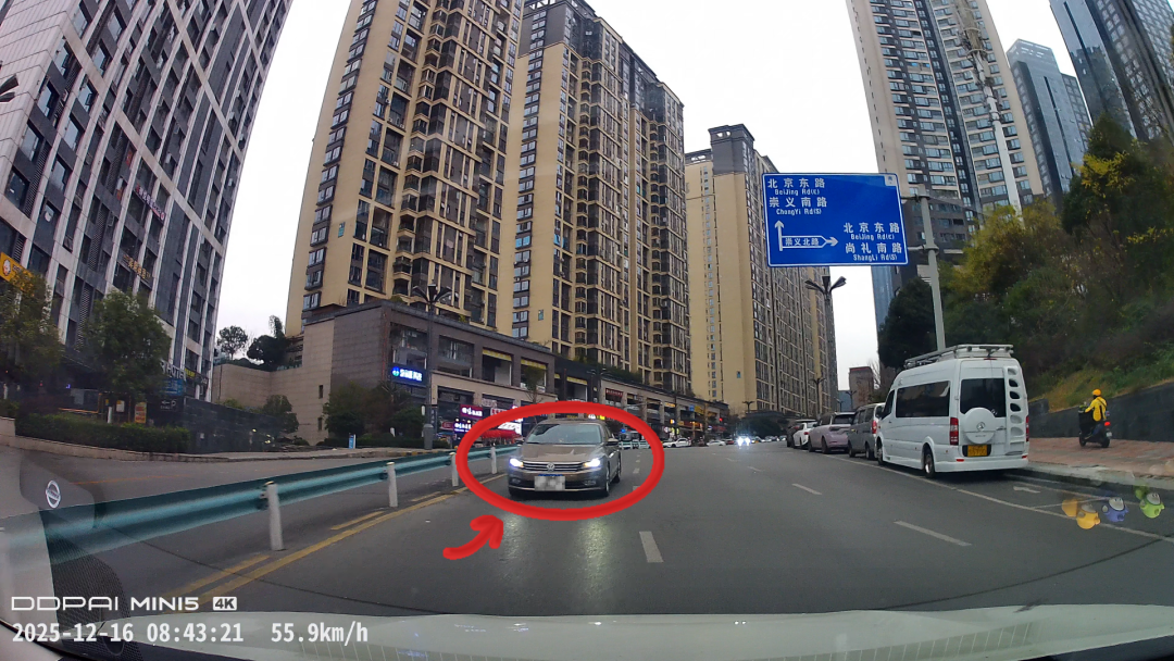 当时市民的车辆正行驶在左侧车道,事发突然,他下意识紧急向右侧变更车道,才堪堪躲过一劫,避免了一起正面碰撞事故。随后市民向云岩区交管分局举报了这辆灰色轿车的违法行为。