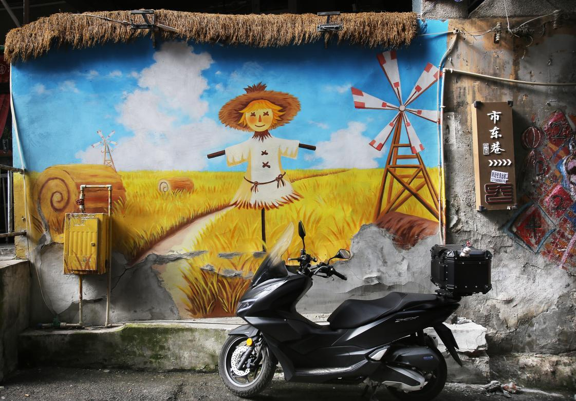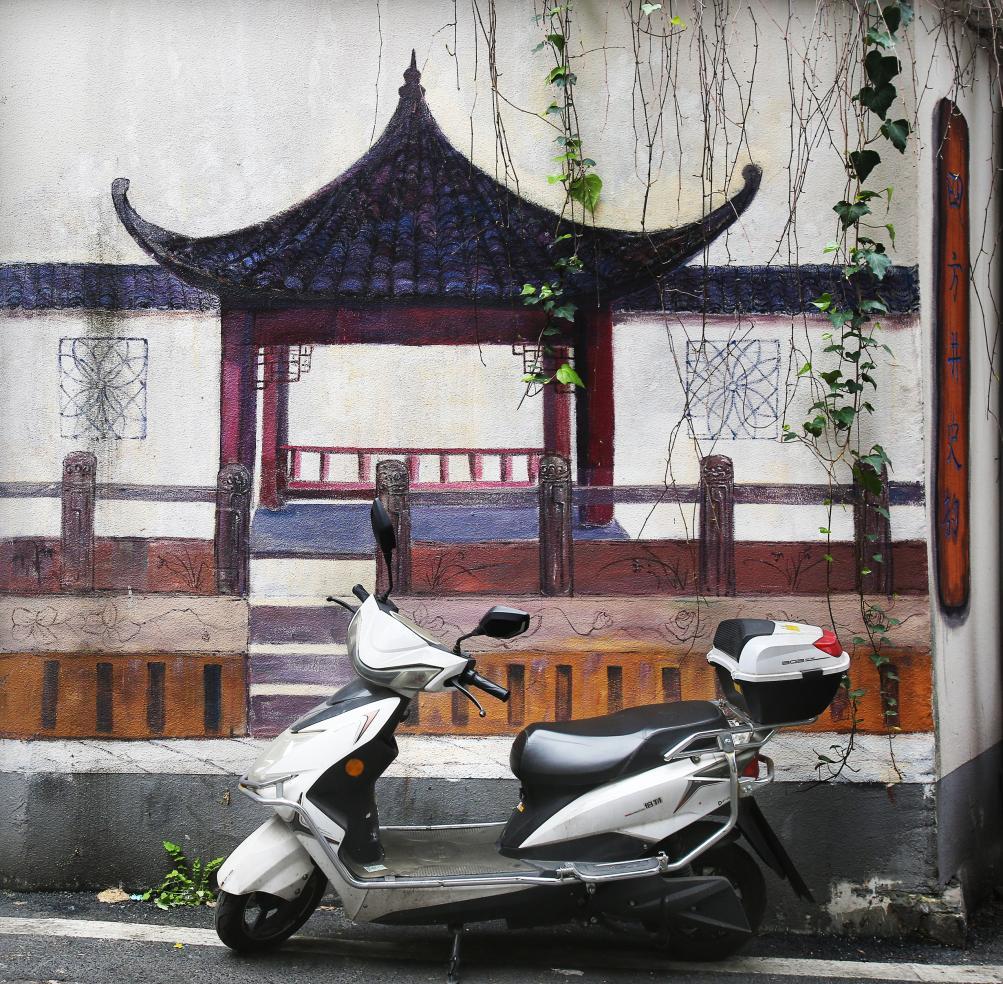 墙绘古亭映巷间,电动车停靠,古韵与日常温柔相遇