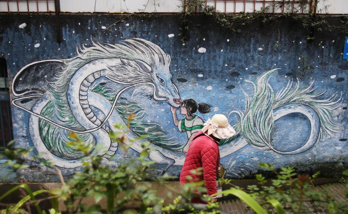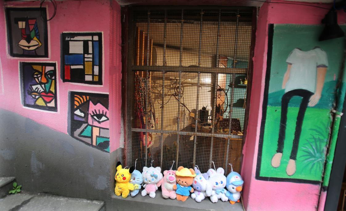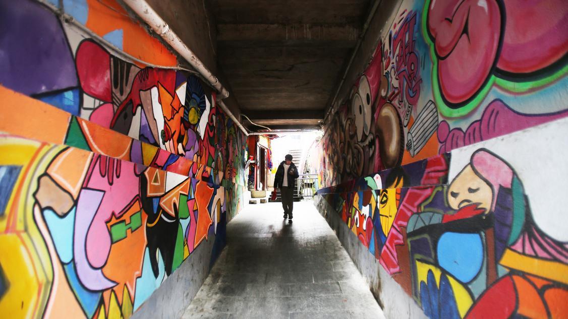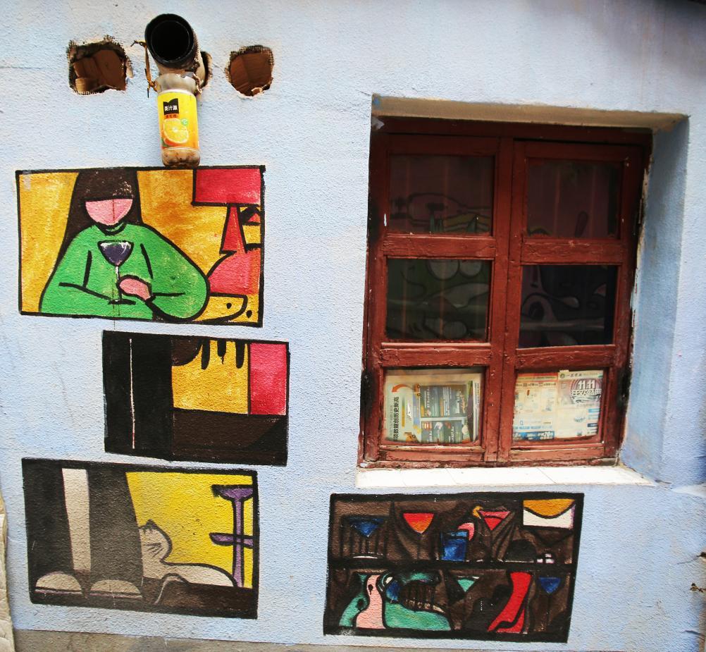 巷边墙面绘满彩图,笔触细腻,满是市井温情