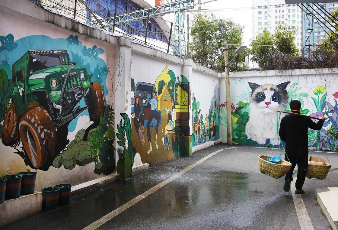 长墙绘满缤纷图案,挑担人走过,新画与旧俗相融