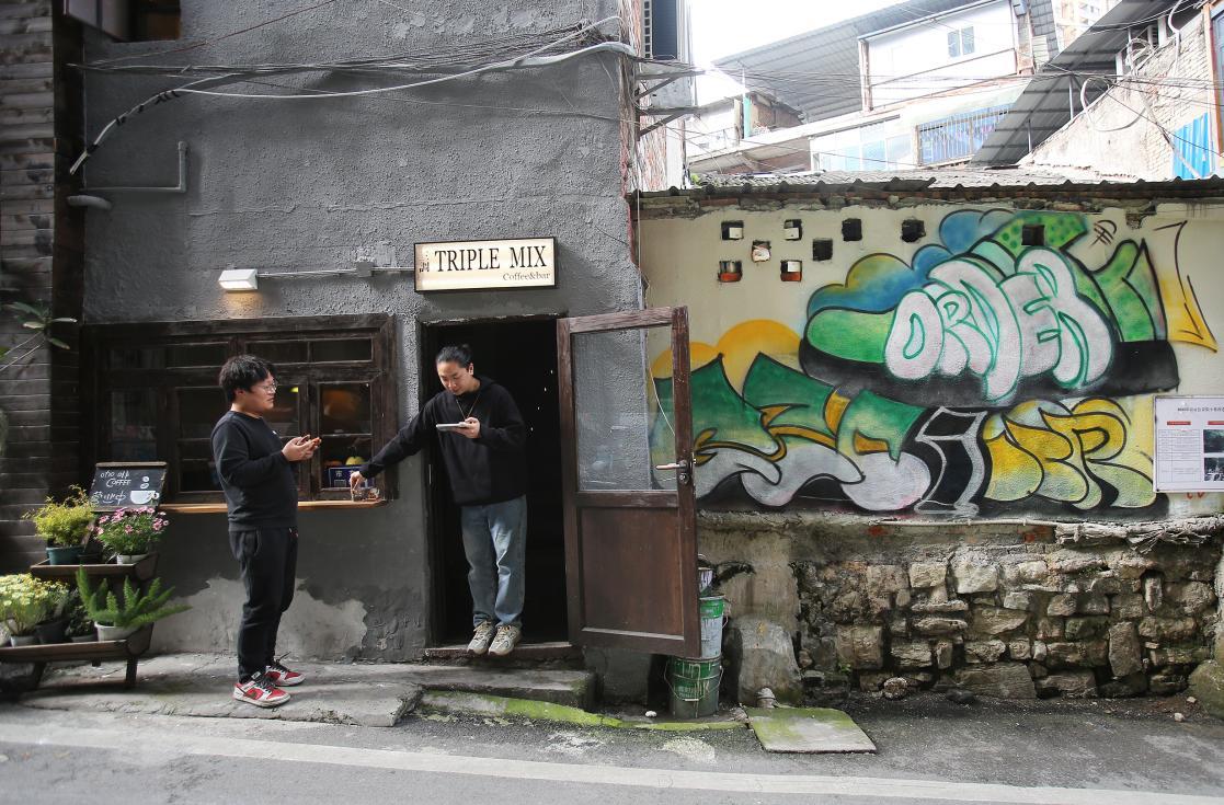 街角小店旁,涂鸦墙撞色灰墙建筑,新潮与老巷相融