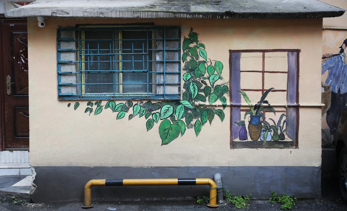 老墙绘藤蔓绕窗,假景似真绿,为巷间添一抹生机