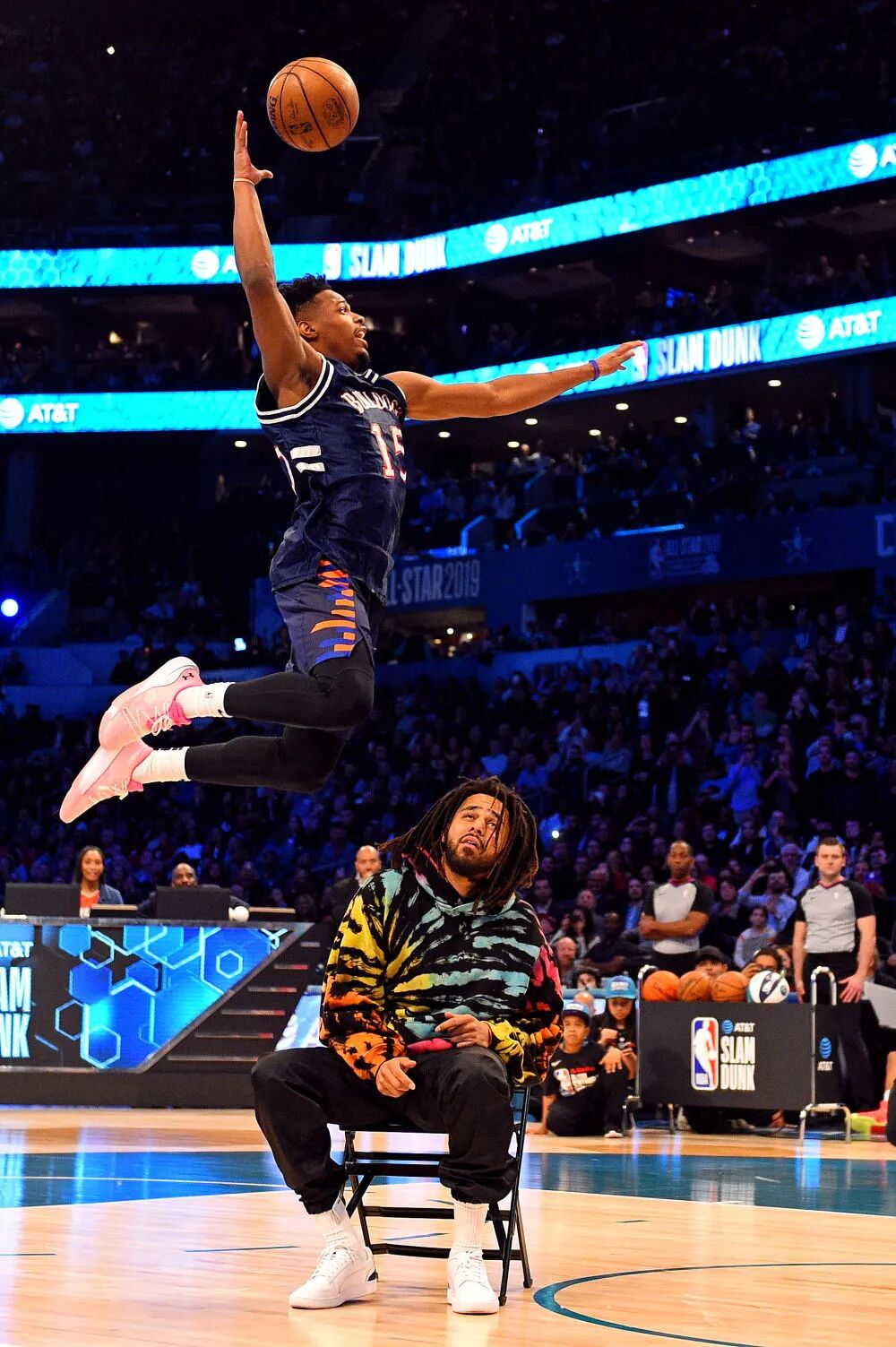 △ 资料图:2019年美职篮(NBA)全明星周末上,J.Cole作为嘉宾参与扣篮大赛