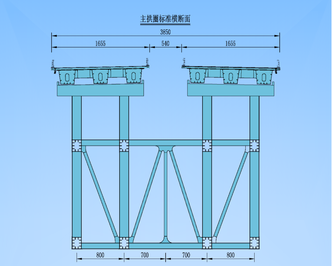 主拱圈构造设计:钢箱桁架组合 实现轻质高强