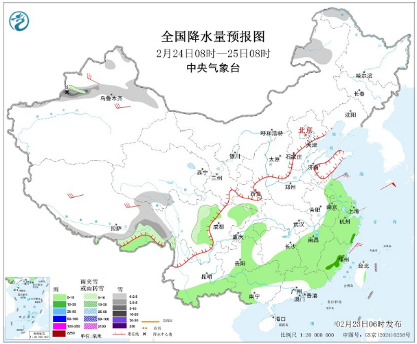 2月24日08时至25日08时,新疆沿天山地区和伊犁河谷、西藏东部、青海南部、川西高原东部、内蒙古东北部、黑龙江西北部等地部分地区有小雪或雨夹雪,其中,新疆伊犁河谷、西藏东部等地部分地区有中到大雪(5~8毫米);江淮东部、江南大部、西南地区东南部、华南北部和西部、台湾岛东部等地部分地区有小到中雨。新疆北部和东部、青海北部、甘肃北部、宁夏、内蒙古、河北北部、黑龙江中北部等地部分地区有4~6级风,阵风7~9级,其中,新疆东部局地阵风风力可达10级以上;黄海南部海域、东海北部的部分海域将有7~8级、阵风9级的风。