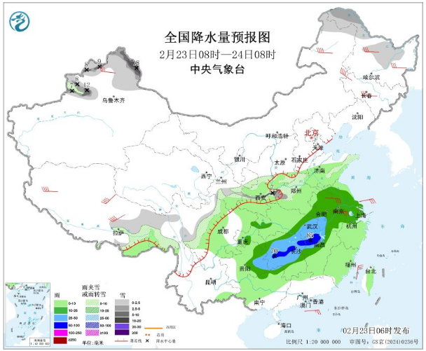 2月23日08时至24日08时,新疆北疆北部和西部山区、内蒙古东北部、黑龙江中北部、山西南部、河南西部和北部、陕西中南部、甘肃南部、川西高原东部、西藏南东部等地部分地区有小到中雪或雨夹雪,其中,新疆北疆北部和西部山区、陕西中部、河南西部等地局地有大到暴雪(10~18毫米);江淮大部、江汉东部、江南北部和西部、西南地区东南部等地部分地区有中到大雨,其中,湖南中部、江西北部等地部分地区有暴雨(50~85毫米)。新疆北疆北部和东部、西藏中西部、青海北部、甘肃北部、内蒙古中部和东部、黑龙江、吉林、江苏西部、云南东部等地部分地区有4~6级风,阵风7~9级,局地可达10级以上;青海东北部、宁夏中北部、陕西中北部、河南、湖北北部、浙江中部等地的部分地区仍有扬沙或浮尘天气;台湾海峡、巴士海峡将有7级、阵风8~9级的风。