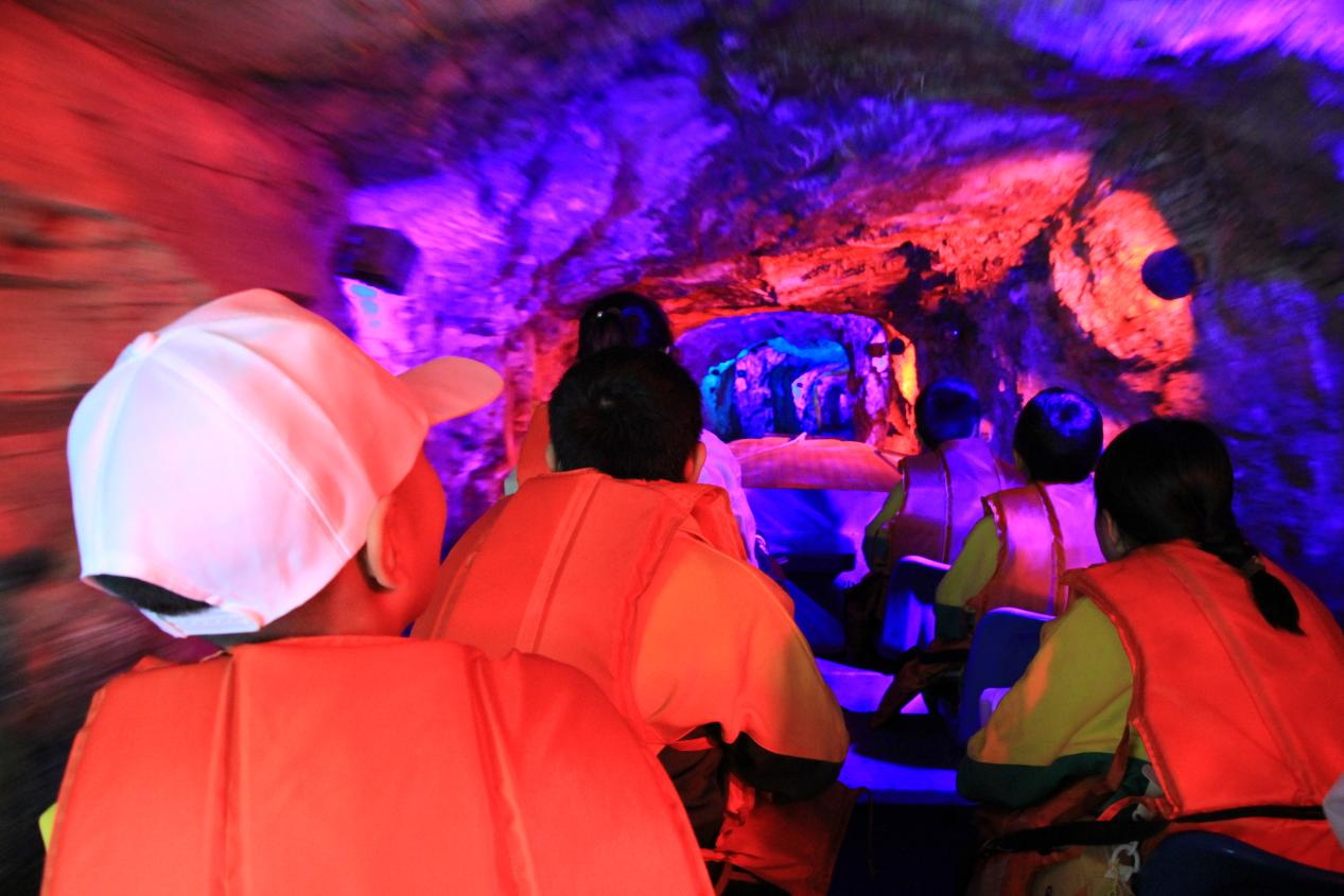 在研学过程中,同学们怀着强烈的好奇心和求知欲,深入了解家乡风物历史文化内容,专业的研学团队以生动有趣的讲解方式,将晦涩的知识转化为通俗易懂的语言,让同学们在轻松愉快的氛围中了解了贵州4A级景区典型喀斯特地貌下的溶洞、瀑布、地下河、华盖滩形成原理,游览了神奇瑰丽的水溶洞景点、仿古化石群、荧光海底隧道、地下天宫等景观。