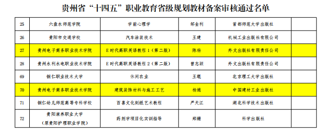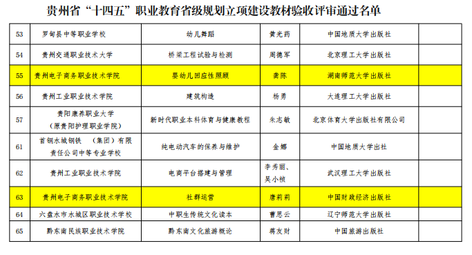 近日,贵州省教育厅公布“十四五”职业教育省级规划教材备案审核和立项建设教材验收评审通过名单,贵州电子商务职业技术学院4本教材通过评审,其中,《E时代高职英语教程 1(第二版)》《建筑装饰材料与施工工艺》顺利通过备案审核,《婴幼儿回应性照顾》《社群运营》成功通过立项建设验收评审。