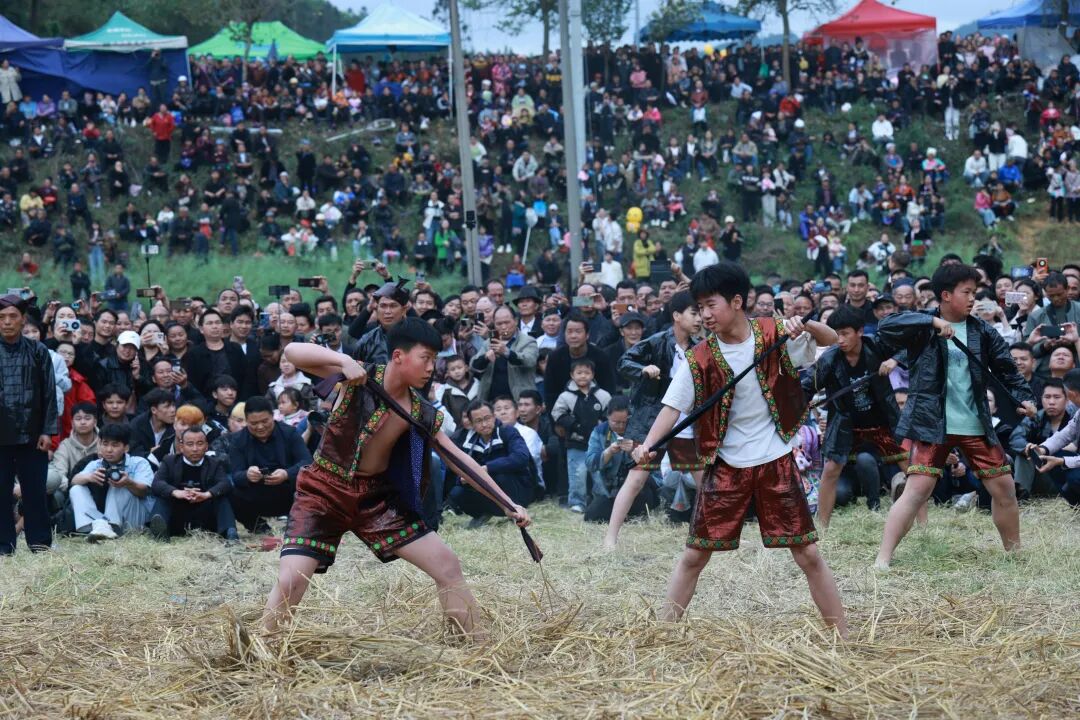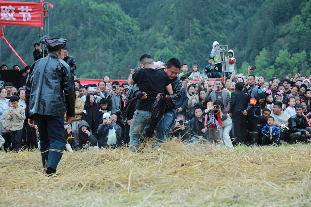 侗族摔跤被誉为文明摔跤,规矩独特,全程不许手抓拉扯,只凭腰腿力量和技巧比拼。赛前选手向寨老行礼取青布带,互缠腰间、肩肩相抵对峙,仪式庄重。伴着芦笙和铁炮声比赛开赛,各村选手两两对阵,青壮年和少年依次上场,不以物质奖励为重,只为村寨争光,现场氛围热闹淳朴。