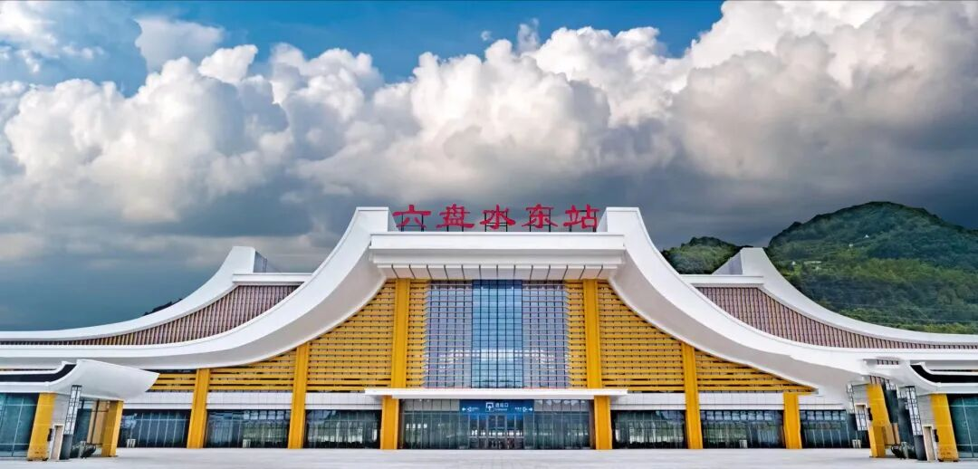 六盘水东站是安六高铁的中间站,六盘水东站以“山水叠韵,魅力凉都”为主题,融入彝族风俗、苗族服饰、三线建设的文化元素,打造历史与现代相结合的文化精品高铁站。站房类型为线侧平式站房,通过厚实形体与抽象的建筑细节虚实结合,隐喻城市水文化特色。建筑整体造型直线和弧线的完美过渡,刚柔相济体现出交通建筑的特有的抽象速度感之美。
