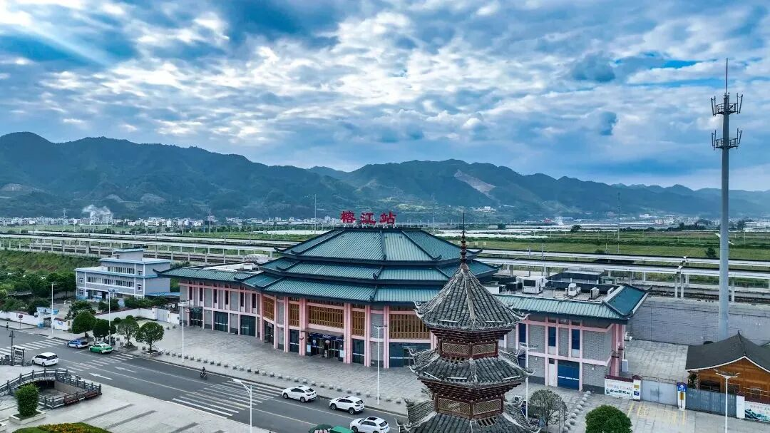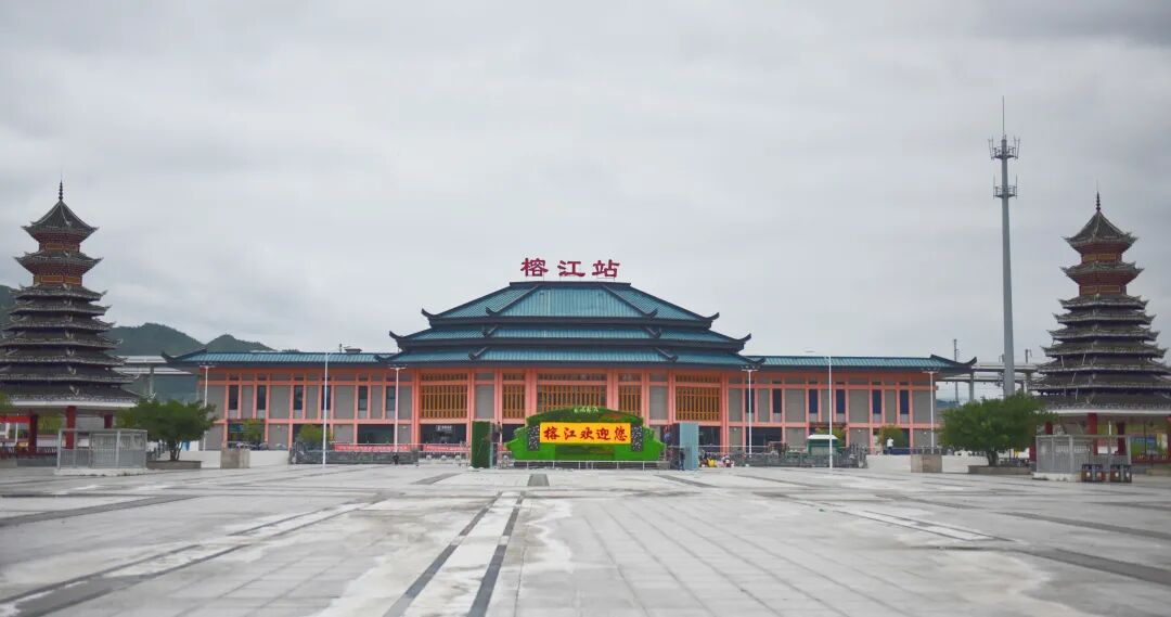 榕江站是贵广高铁的中间站,站房屋面采用钢网架设计,外观充分结合当地侗族鼓楼造型,设计像一座侗寨鼓楼,三层屋檐,层层而上,飞檐走阁,民族气息浓郁。榕江站以“侗寨飞檐,江韵流芳”为设计灵魂,将侗家建筑的灵动与都柳江的温婉揉碎于钢筋水泥之中,成为高铁线上一座会“吟唱”的民族建筑。