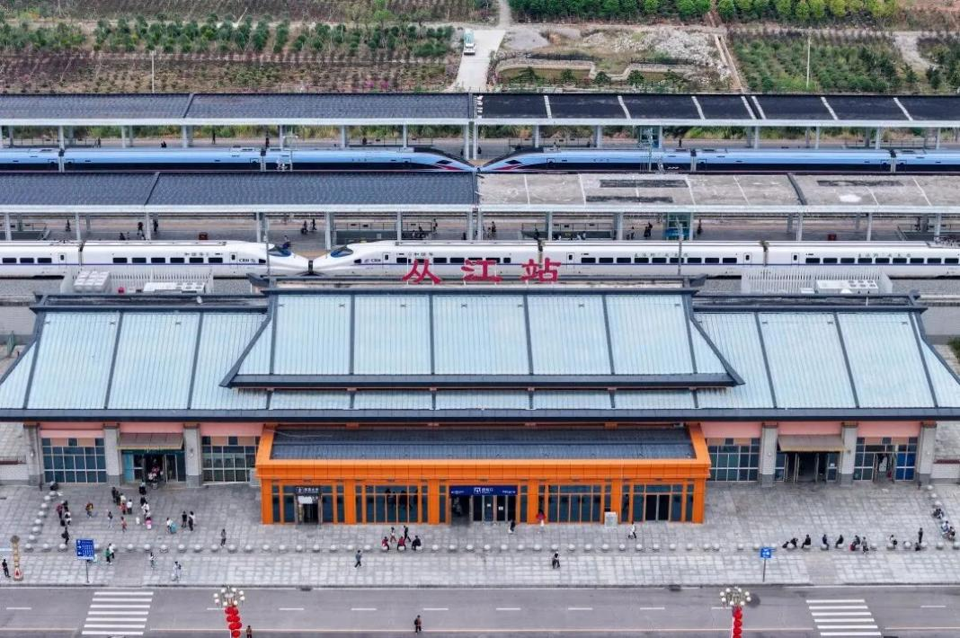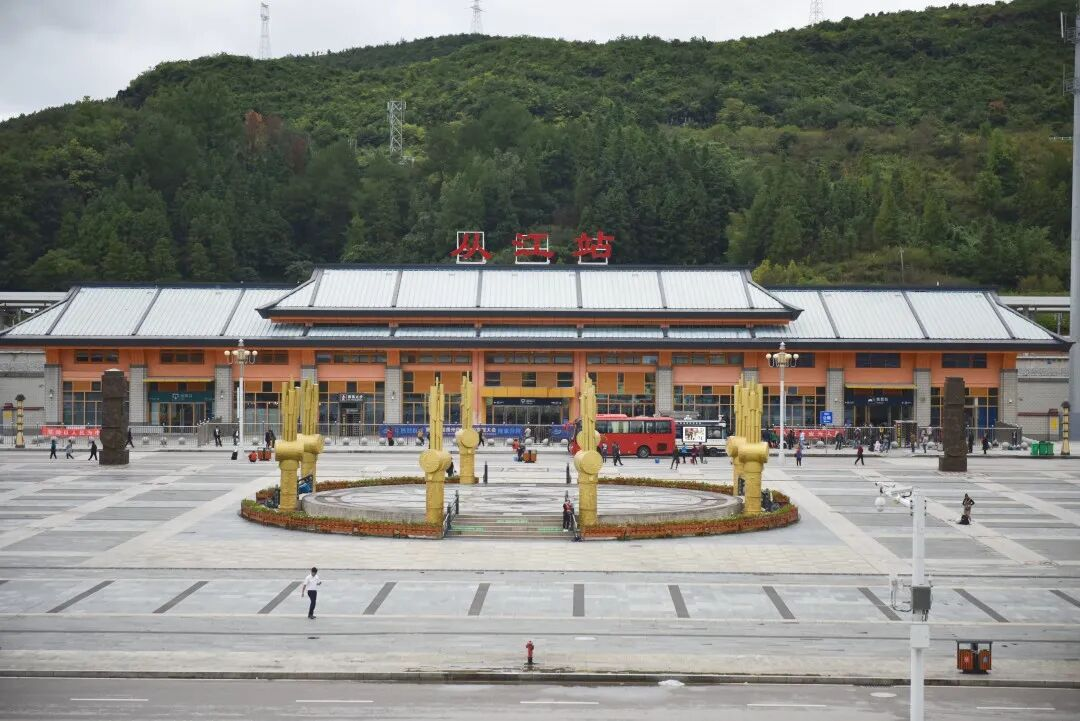 从江站也是贵广高铁的中间站,站房融合了鼓楼与花桥等侗族建筑风格,两层设计,车站主体造型以侗族传统“干栏式”建筑为原型载体,屋顶采用错落式坡顶结构体系,通过建筑形态对侗寨层层叠叠的屋檐进行现代转译,实现了传统元素与现代功能的有机统一。