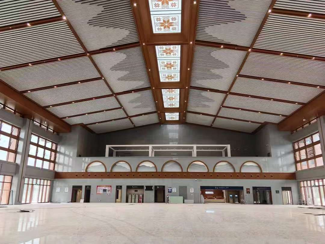 候车大厅室内空间模拟山峦起伏,将万峰林的峰丛形态融入每个细节。网格状弧形井次梁错落有致,银白色铝板纹样点缀空间,光影在梁体表面流转,刚柔相济,为严谨的结构注入诗意的温度。