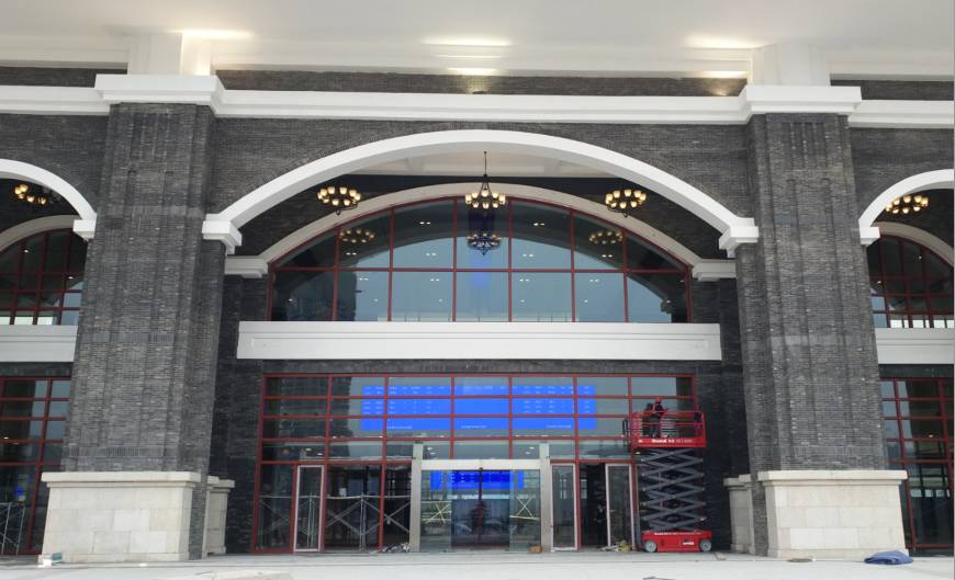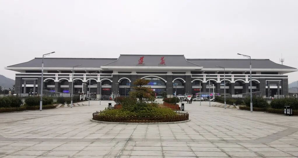 遵义站是渝贵铁路和川黔铁路的中间站,这座酷似遵义会议会址的高铁站,已成为区域旅游的重要入口。站房设计以遵义会议会址为原型,采用了三段式立面风格,保留柱廊、拱券等特色元素,外墙采用黏土青砖砌筑清水墙面,加上大气的两层歇山屋顶,以会址代表性的灰色、白色建筑色为主色调,搭配朱红色的门框,加上五角星的点缀,简洁而又经典,是遵义市的标志性建筑之一。