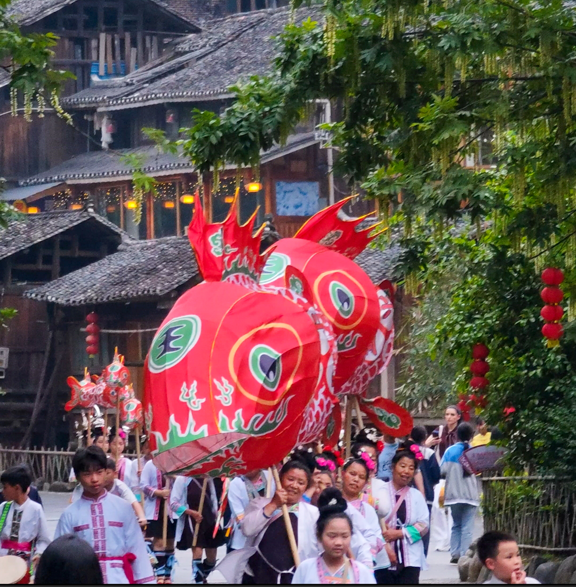 此外,拦门敬酒、芦笙迎宾、农耕抓鱼、长桌宴、鱼灯巡游、“打花脸”等民俗活动轮番上演,全方位还原侗族传统生活场景。游客与侗胞同欢同乐,在沉浸式体验中感受侗族人民的热情好客,体验“雨生百谷、人欢年丰”的节日氛围 。
