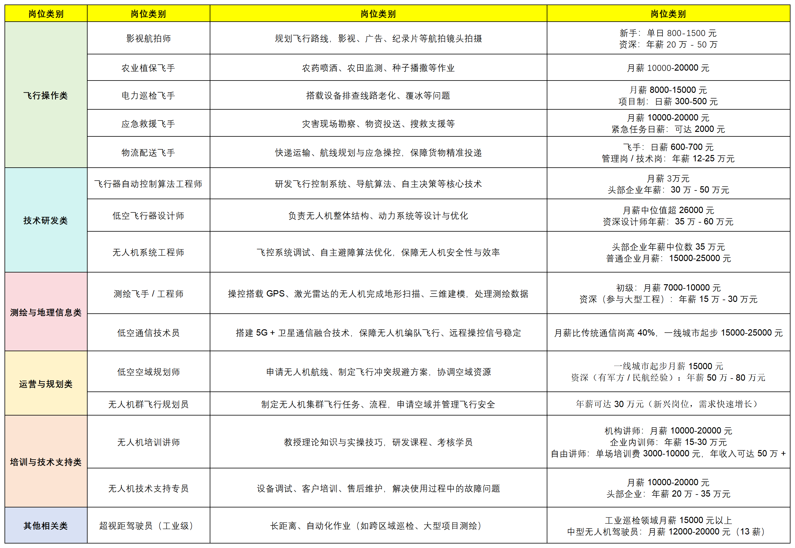 更具吸引力的是薪资水平。基础飞手月薪可达10000—20000元,中级飞手轻松就能实现每月1.5—3万元的收入,资深行业应用工程师年薪超过50万。自主创业接单的航拍、吊运、植保、测绘飞手,单日收入甚至能达到2000—8000元!选择无人机行业,就是选择一条“前景广阔、薪资丰厚、竞争较小”的黄金赛道。